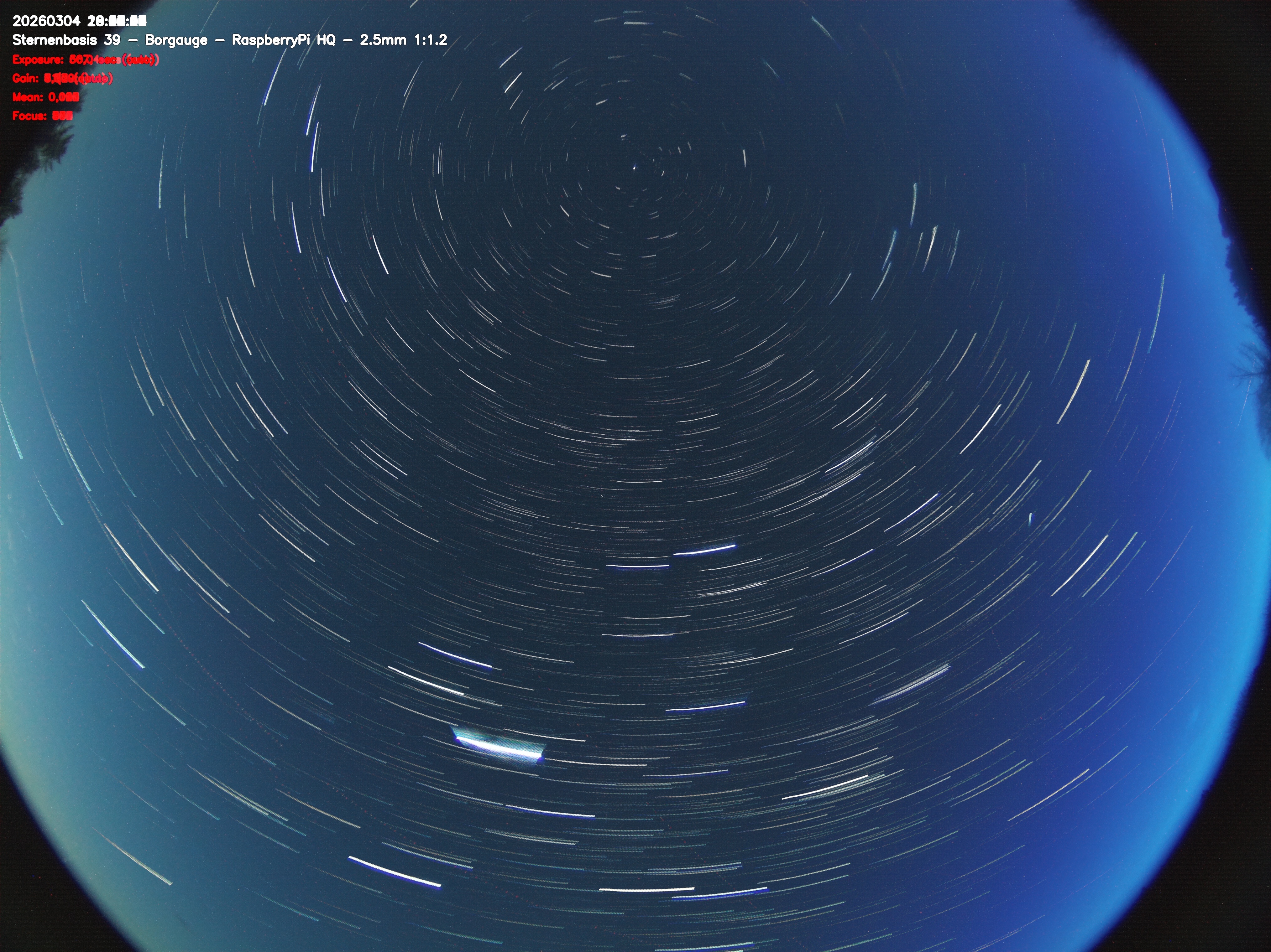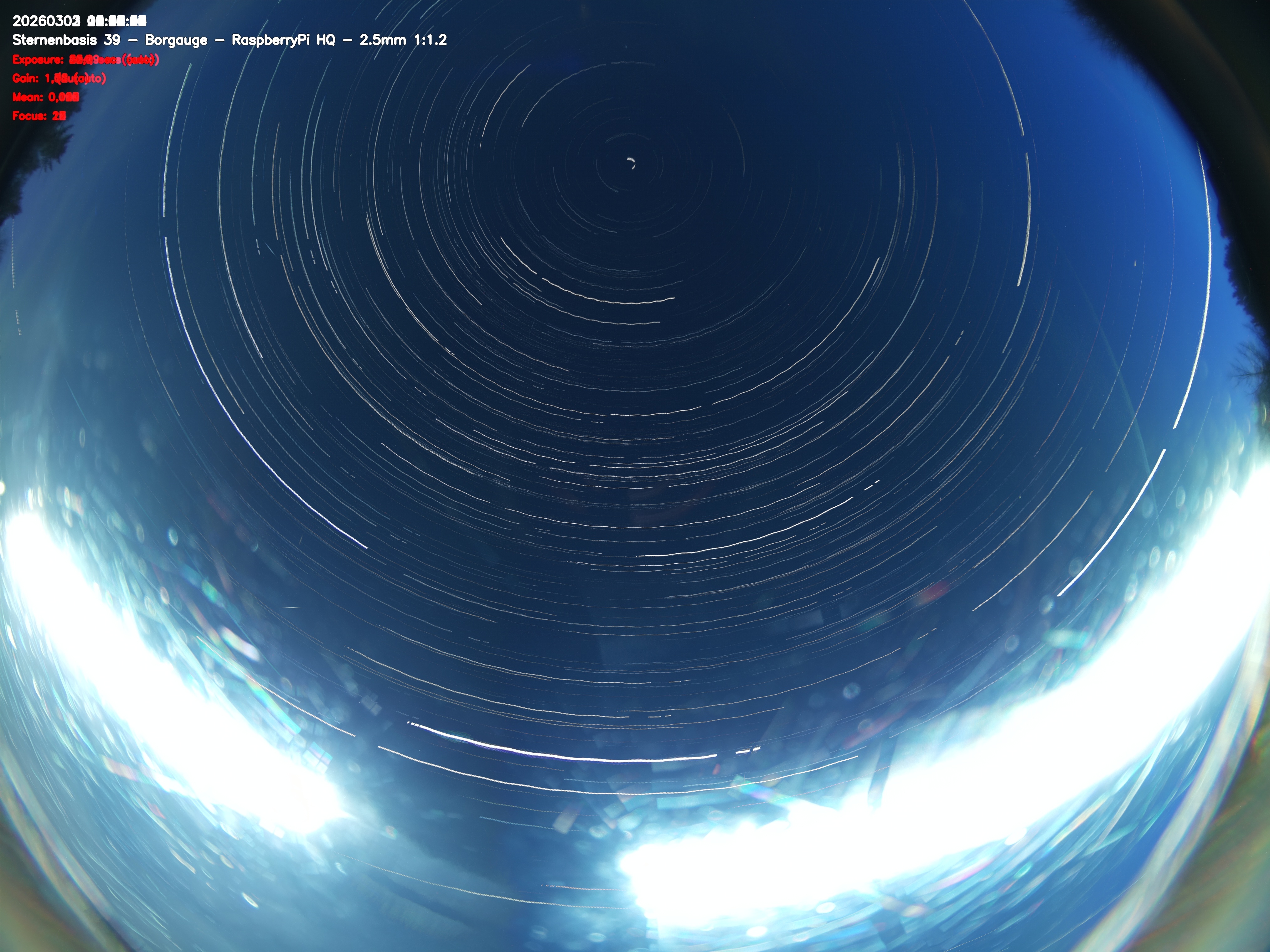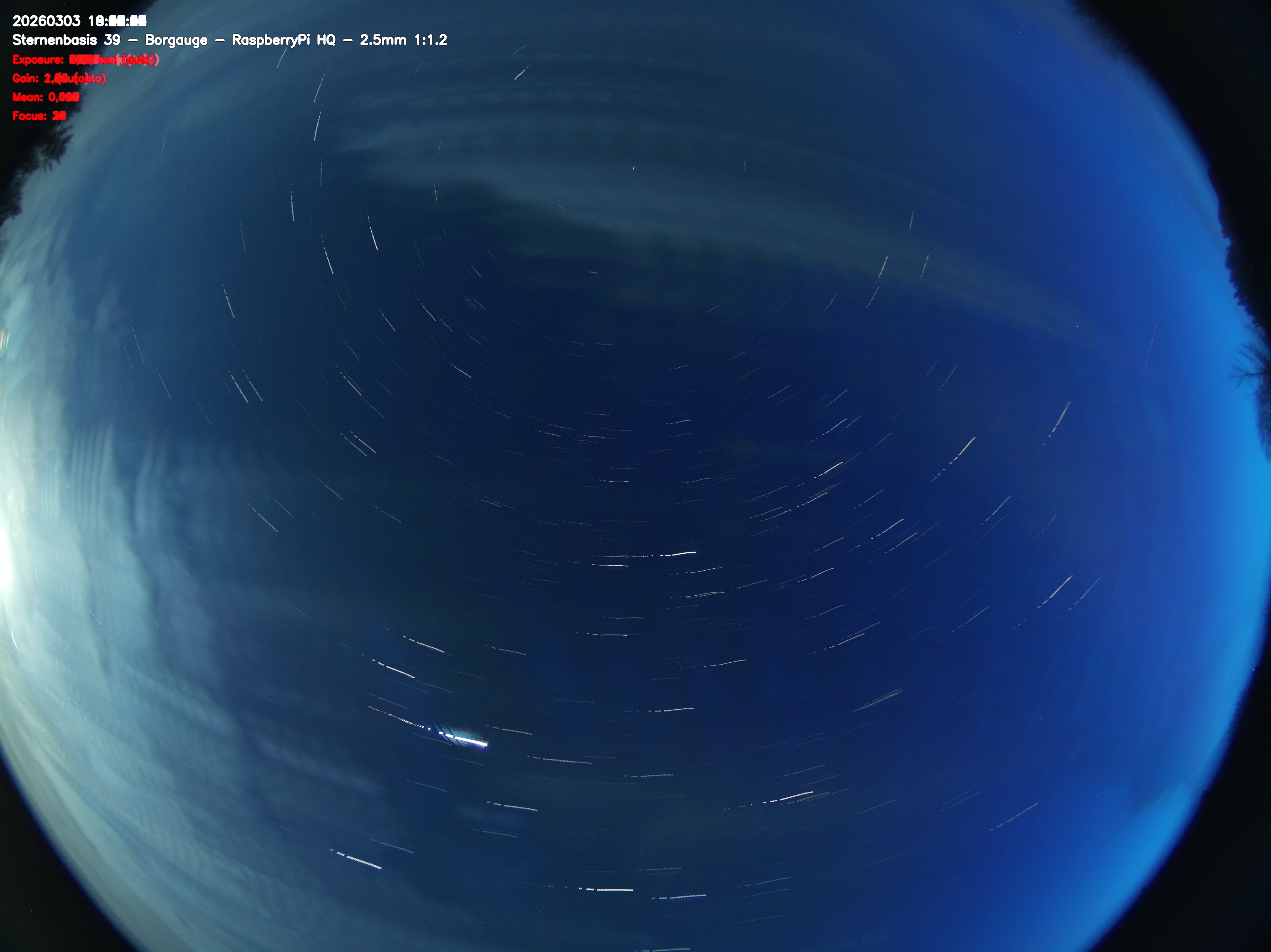 Version 2 der Allsky Kamera auf Sternenbasis 39. Die Aufnahme zeigt den Himmel auf Sternenbasis 39. Oben ist Norden. Westen ist rechts.- automatische Aktualisierung alls 90 Sekunden -