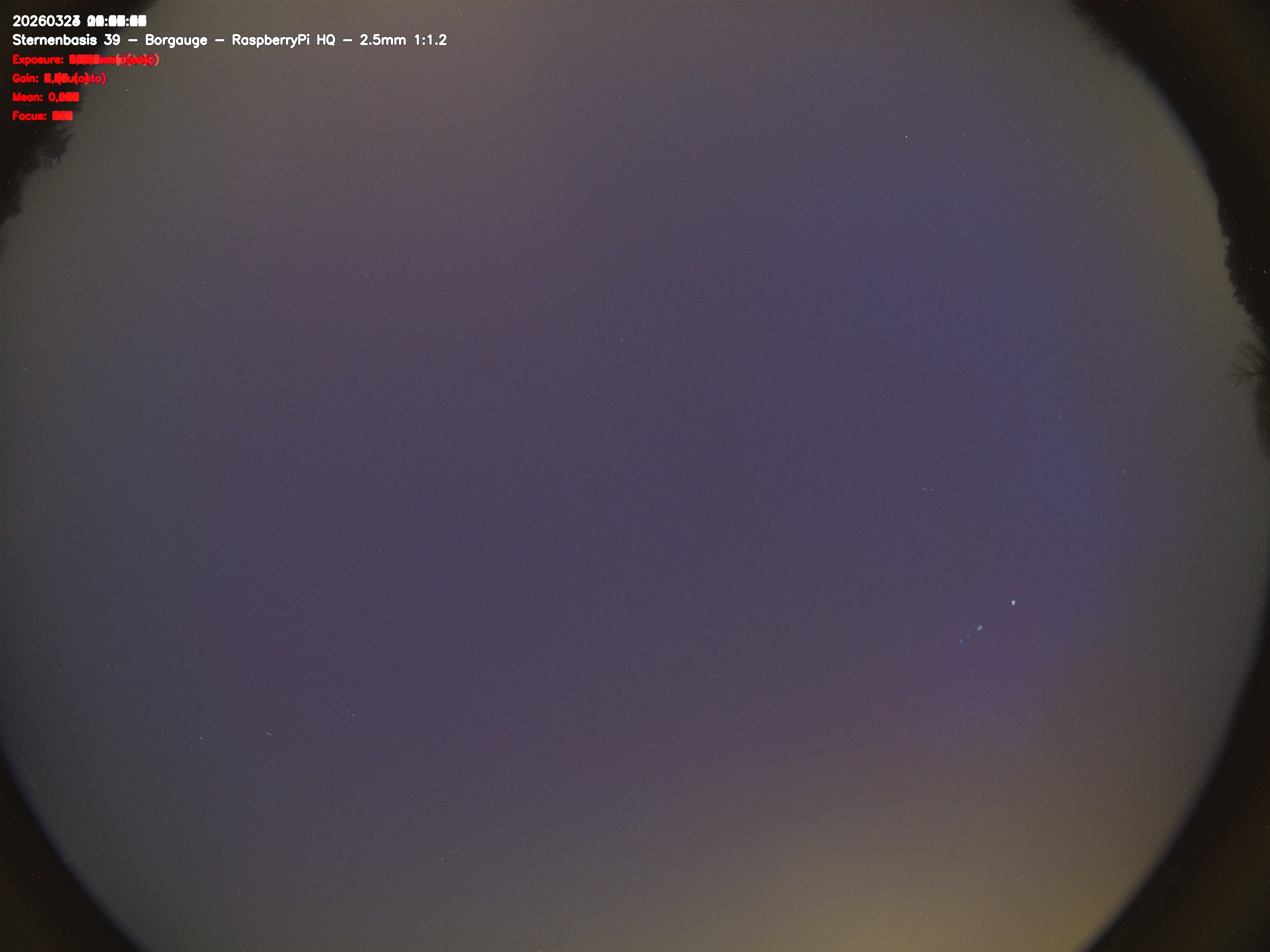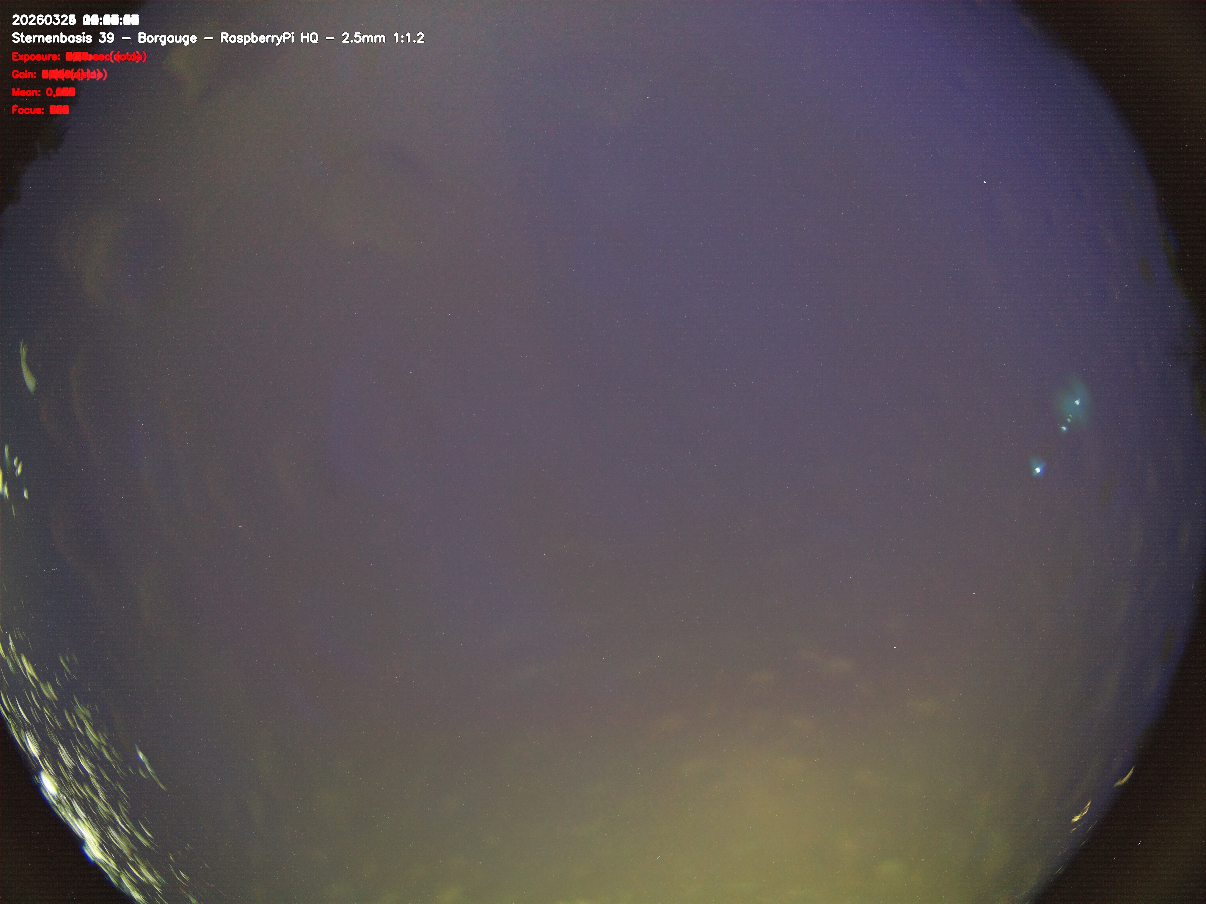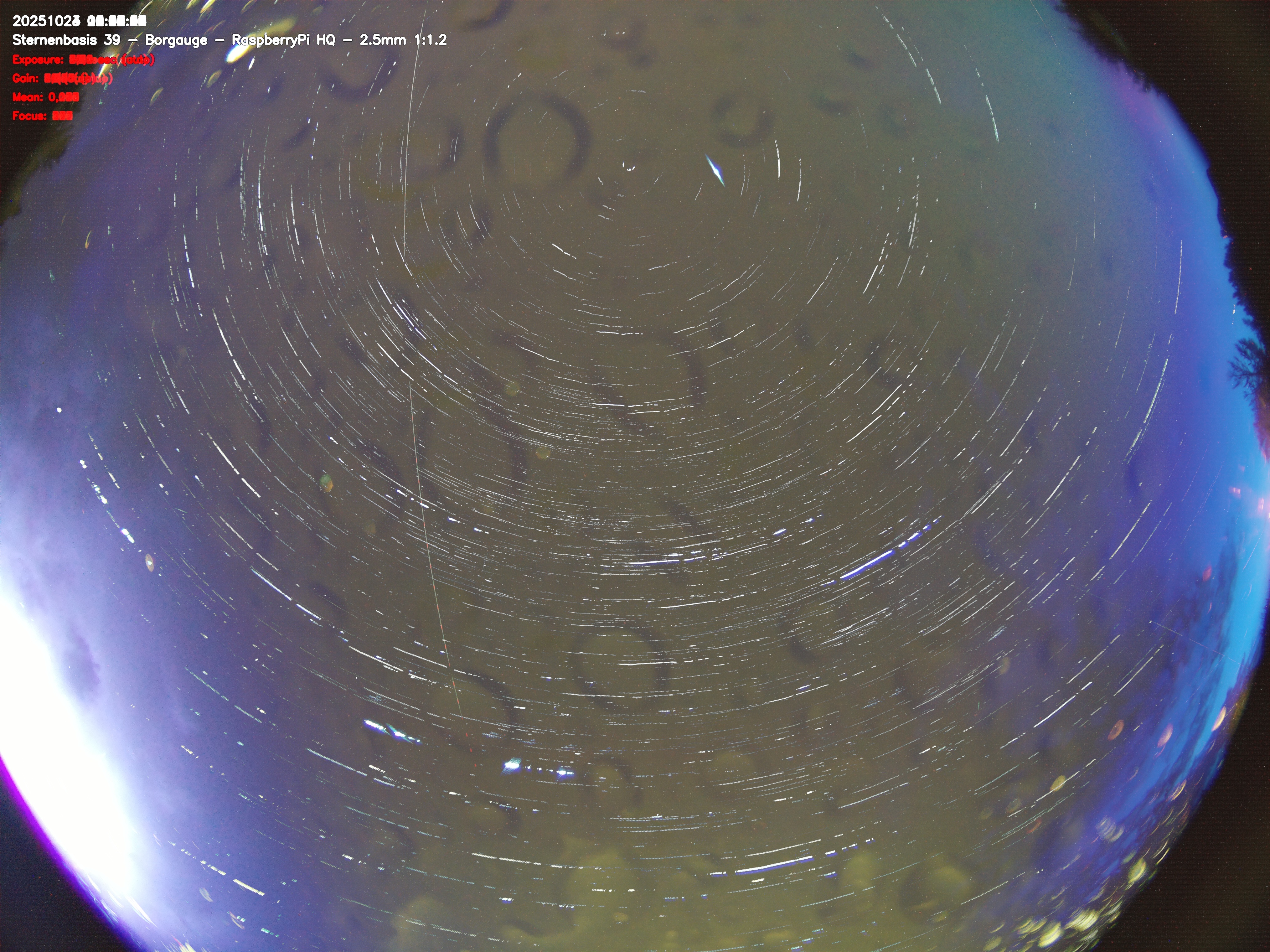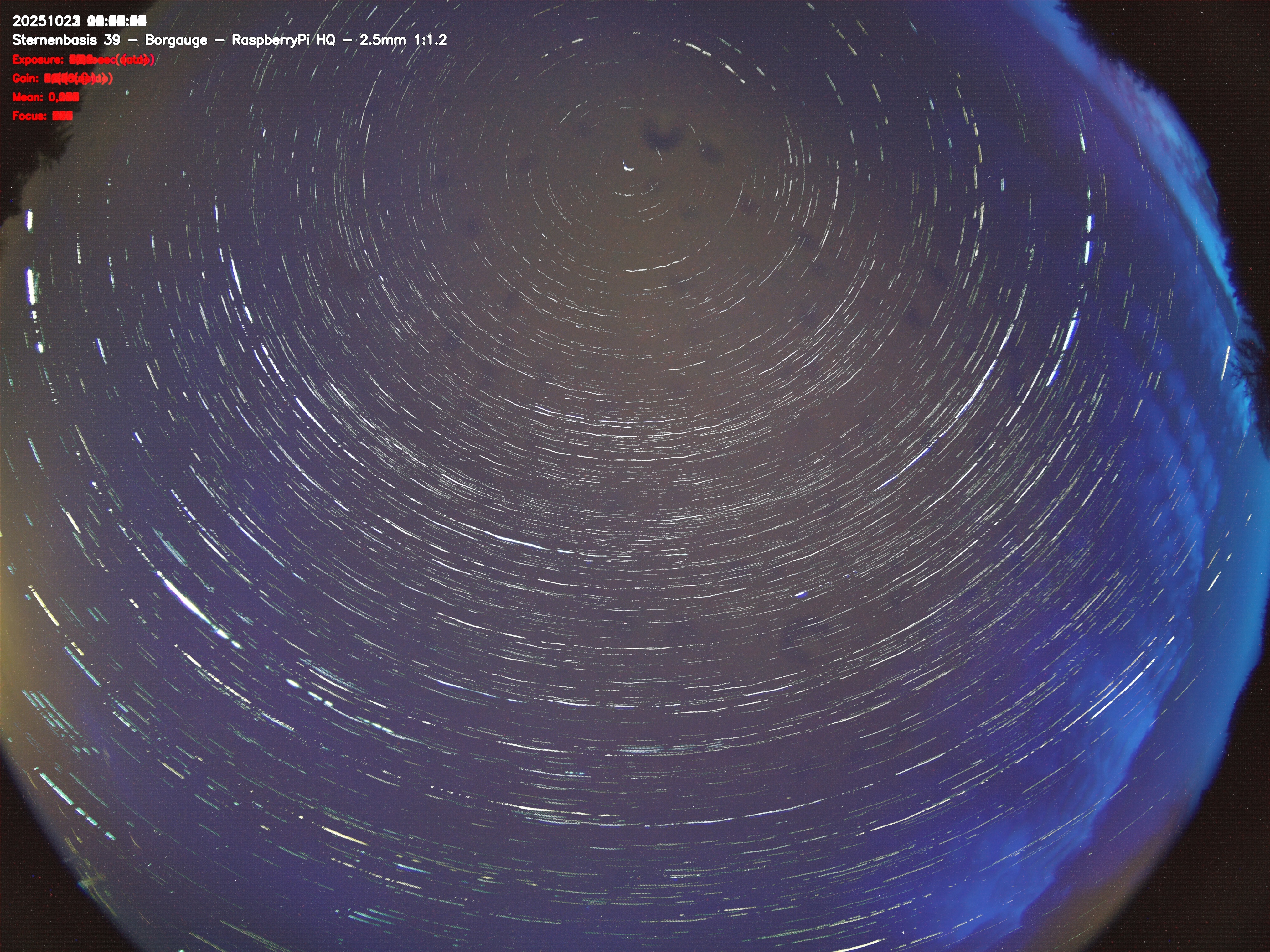 Version 2 der Allsky Kamera auf Sternenbasis 39. Die Aufnahme zeigt den Himmel auf Sternenbasis 39. Oben ist Norden. Westen ist rechts.- automatische Aktualisierung alls 90 Sekunden -