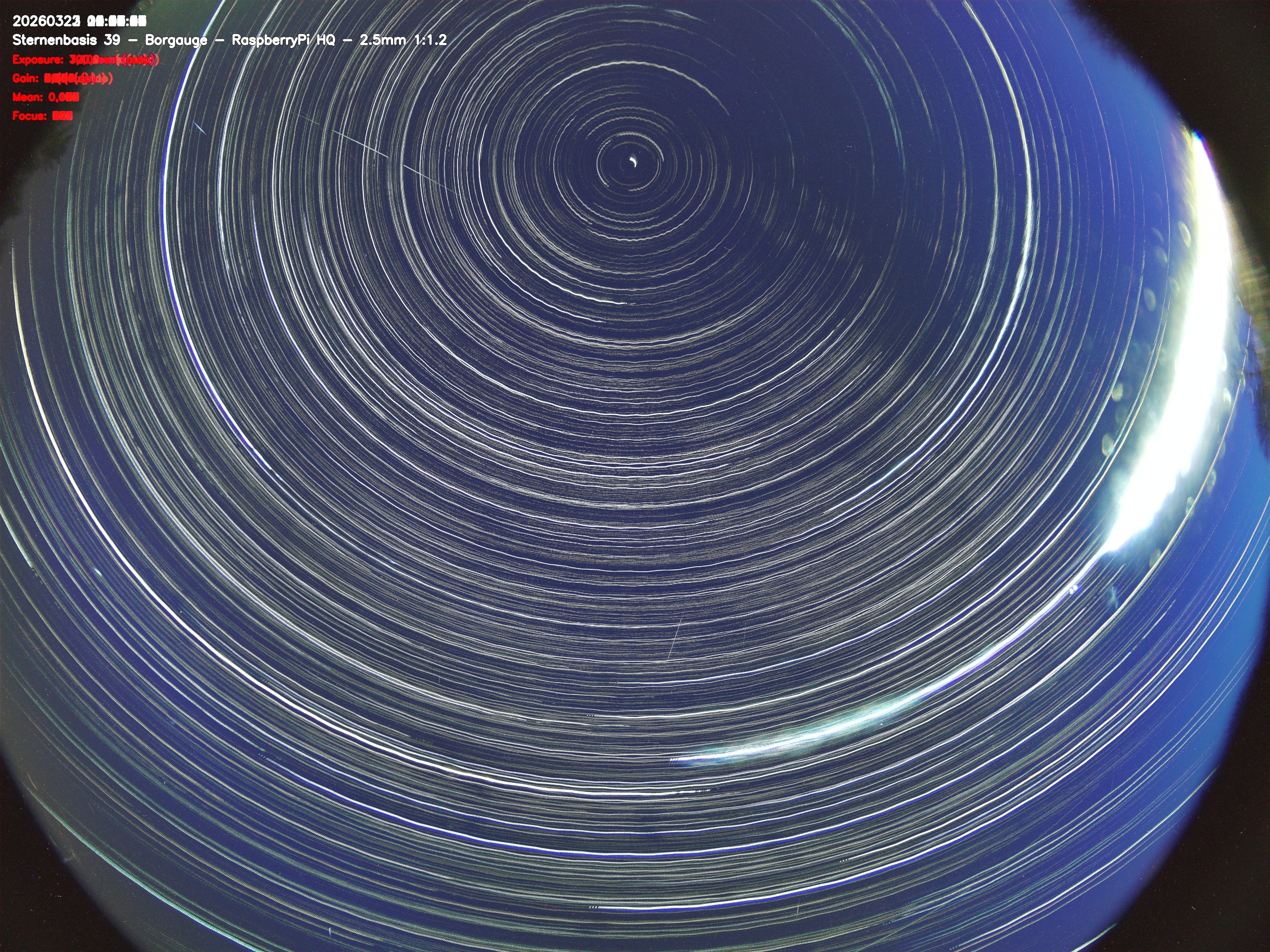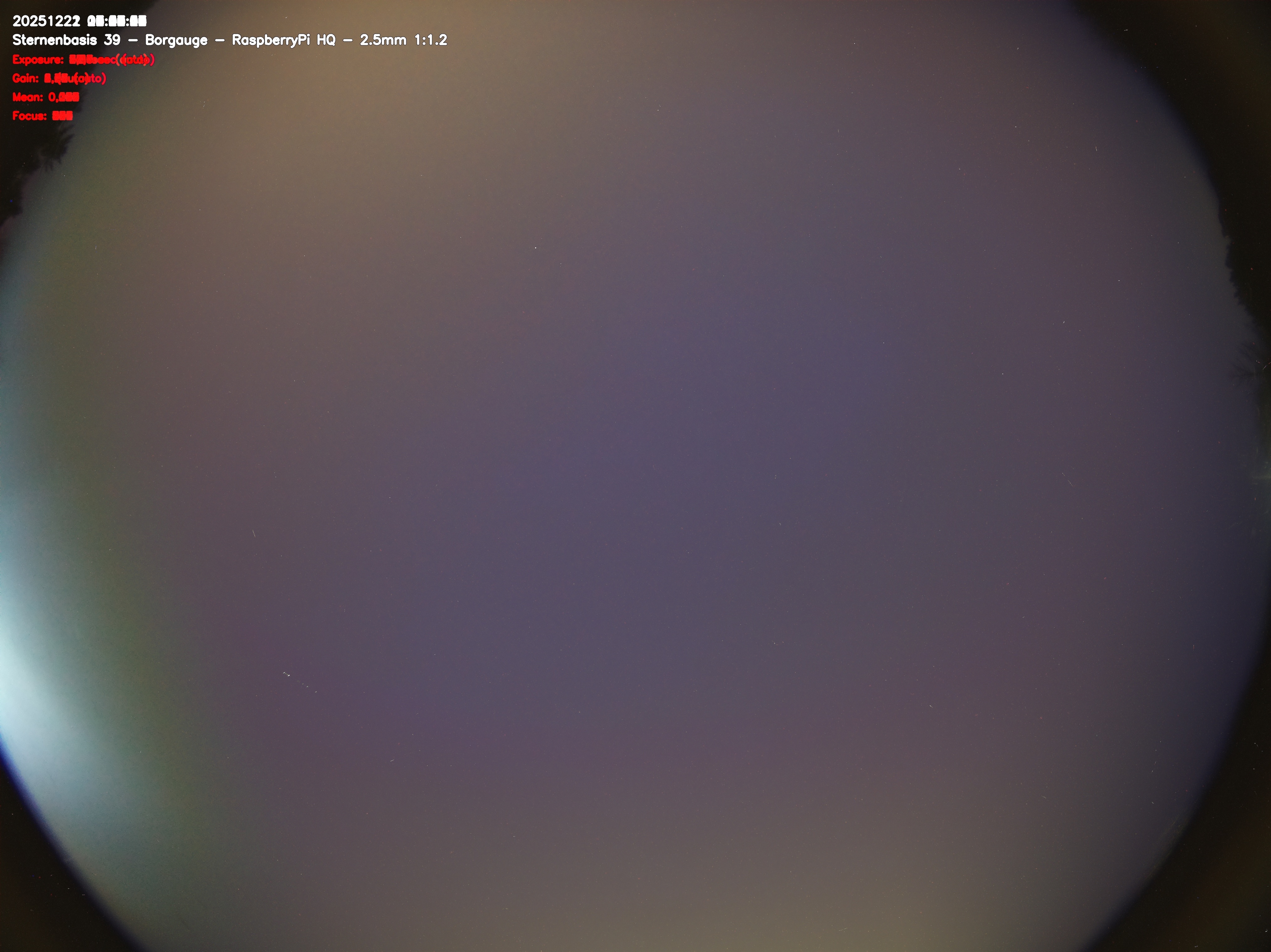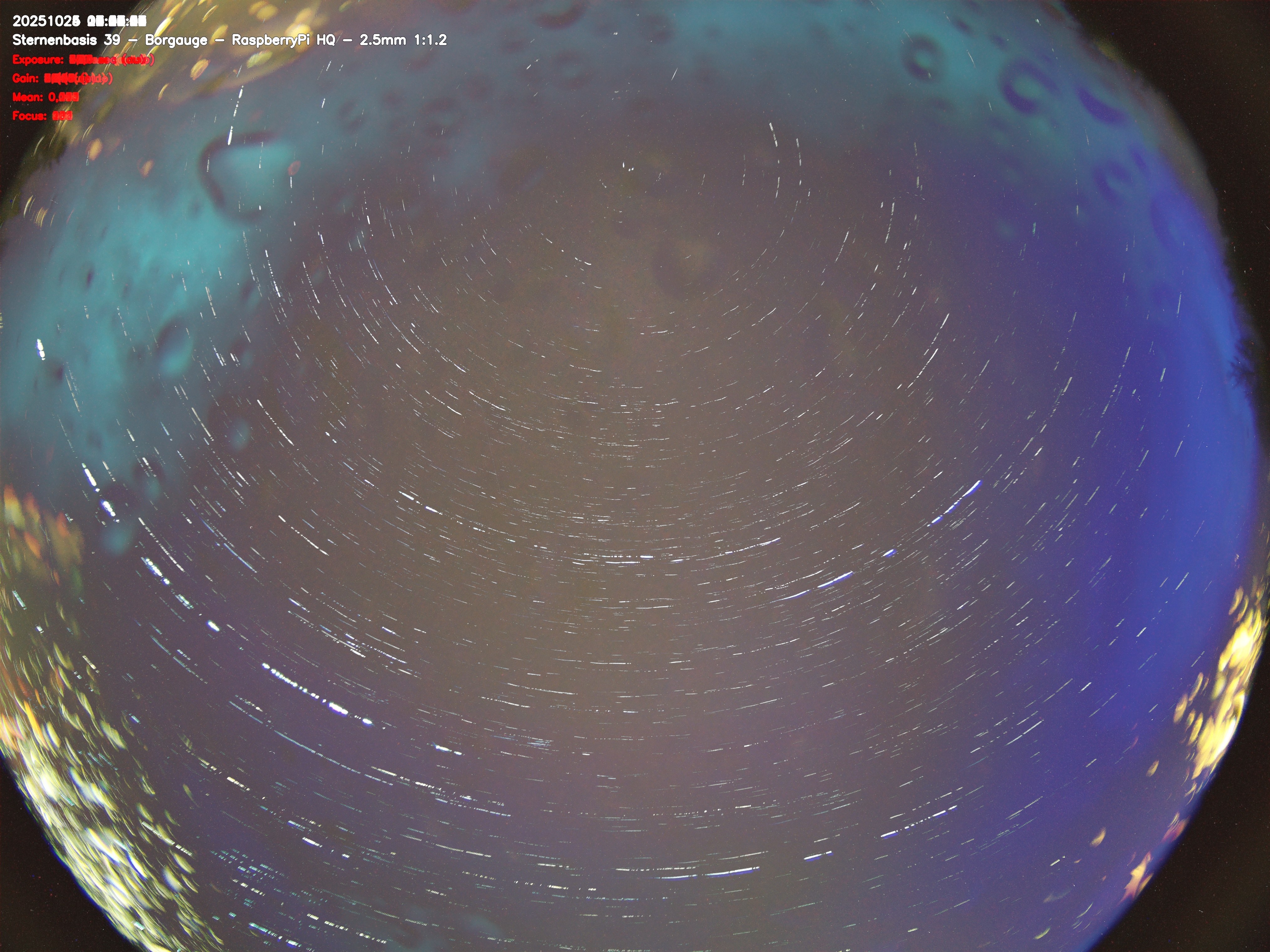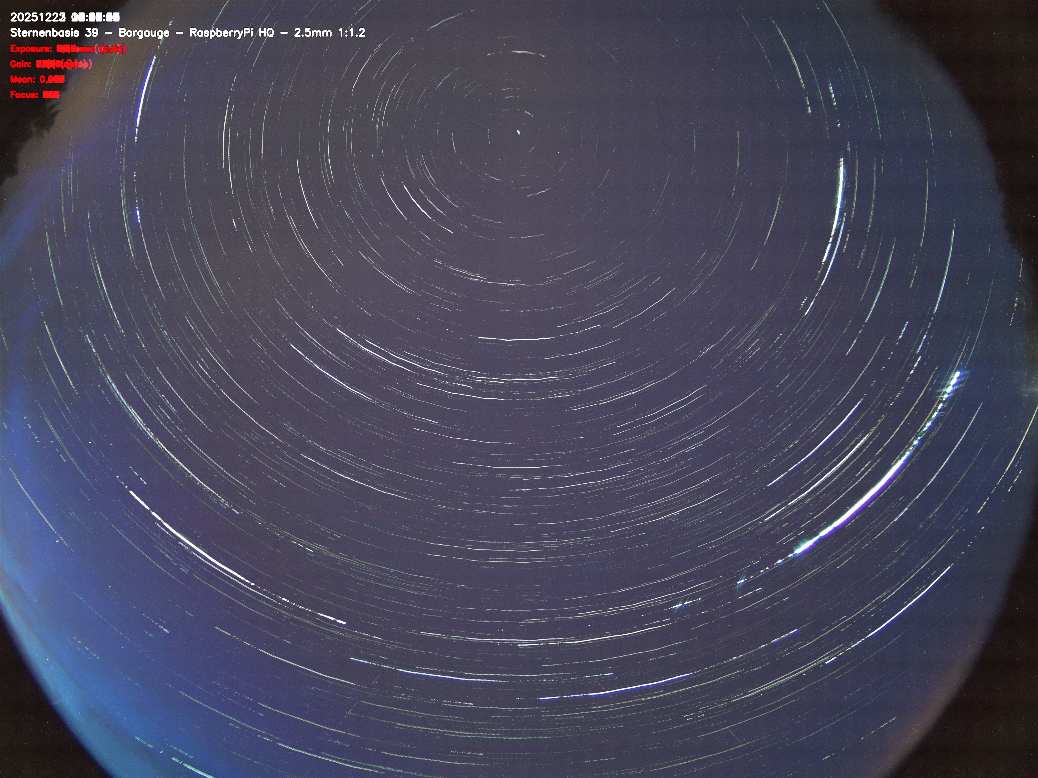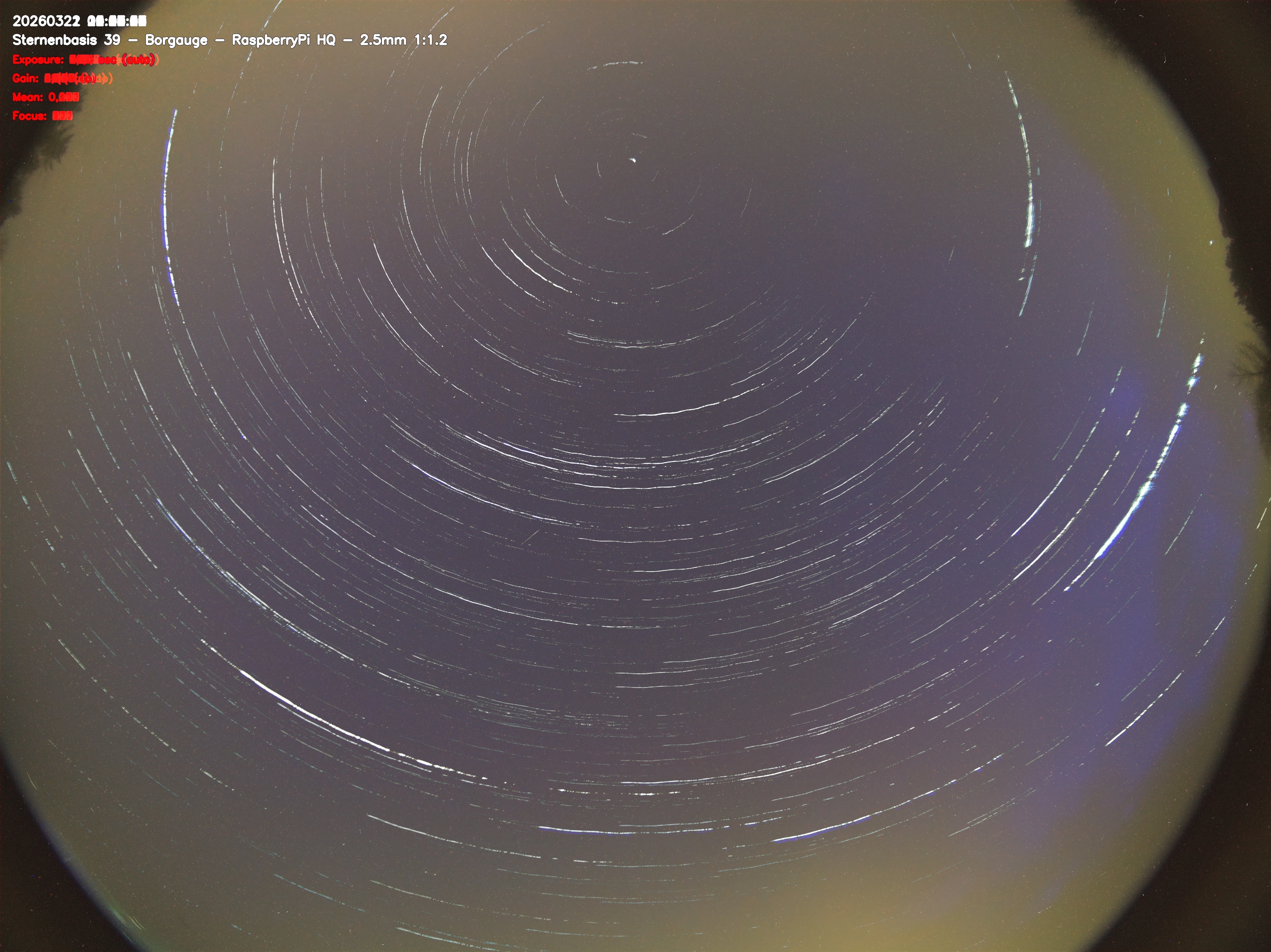 Version 2 der Allsky Kamera auf Sternenbasis 39. Die Aufnahme zeigt den Himmel auf Sternenbasis 39. Oben ist Norden. Westen ist rechts.- automatische Aktualisierung alls 90 Sekunden -