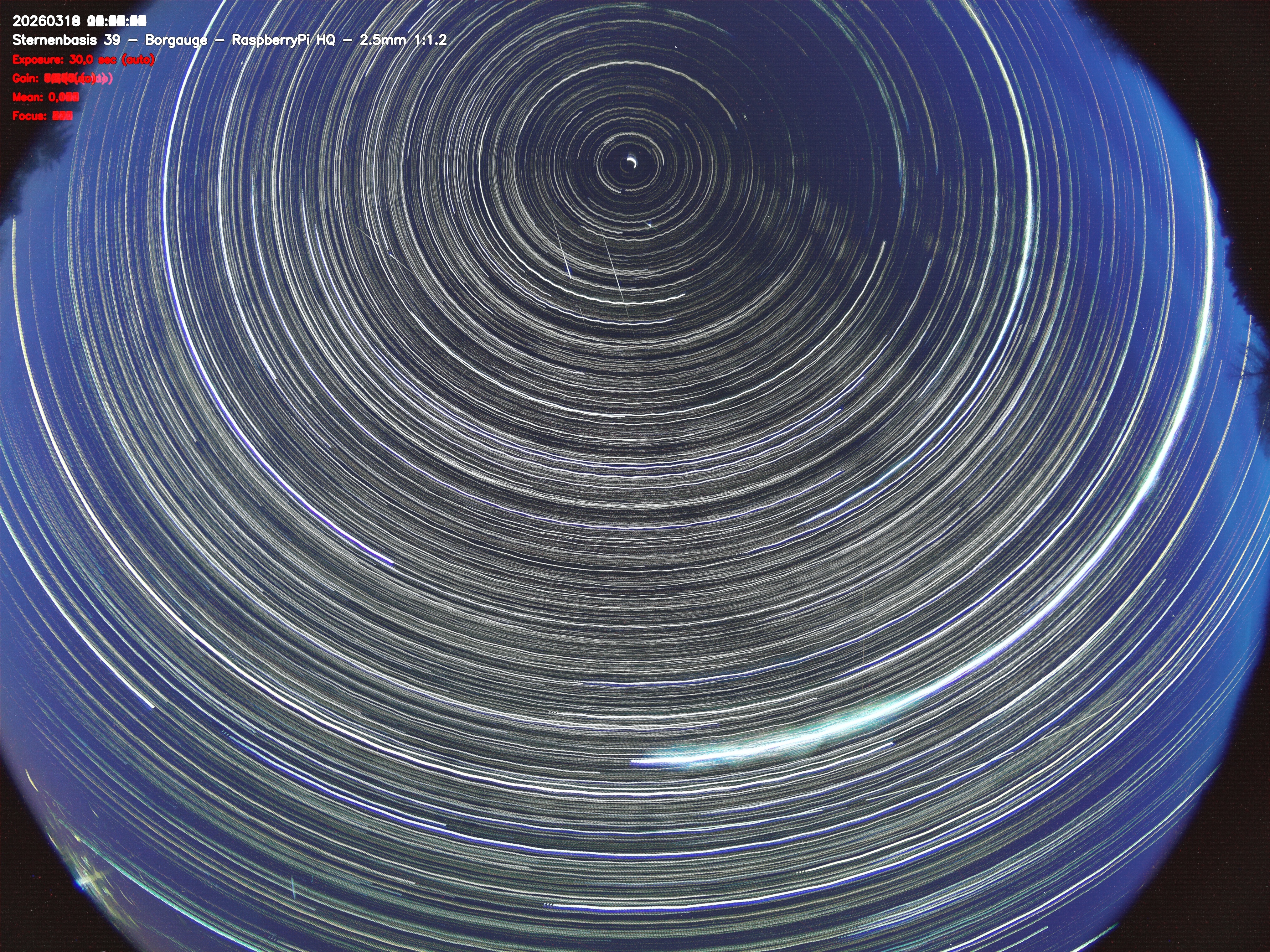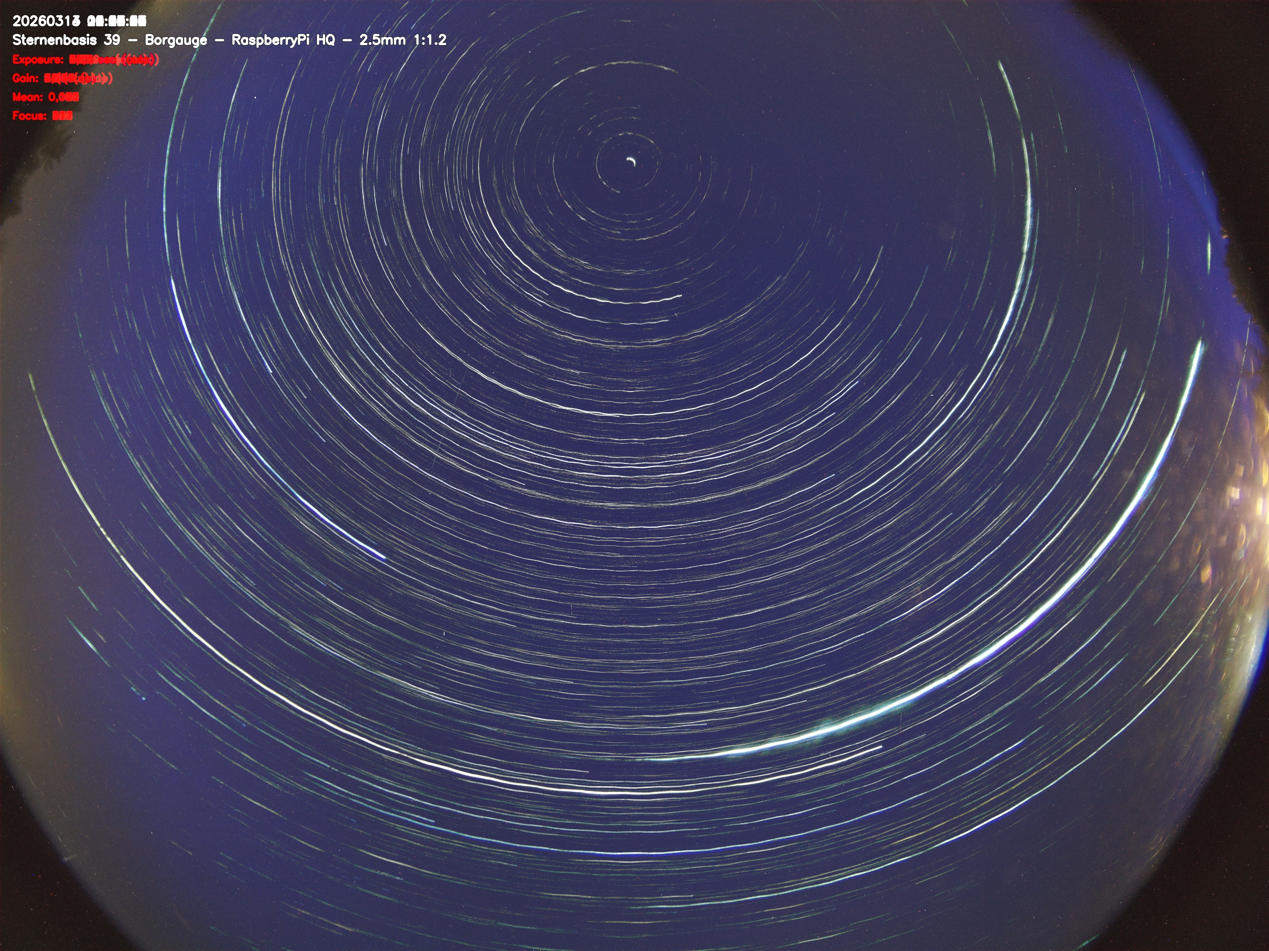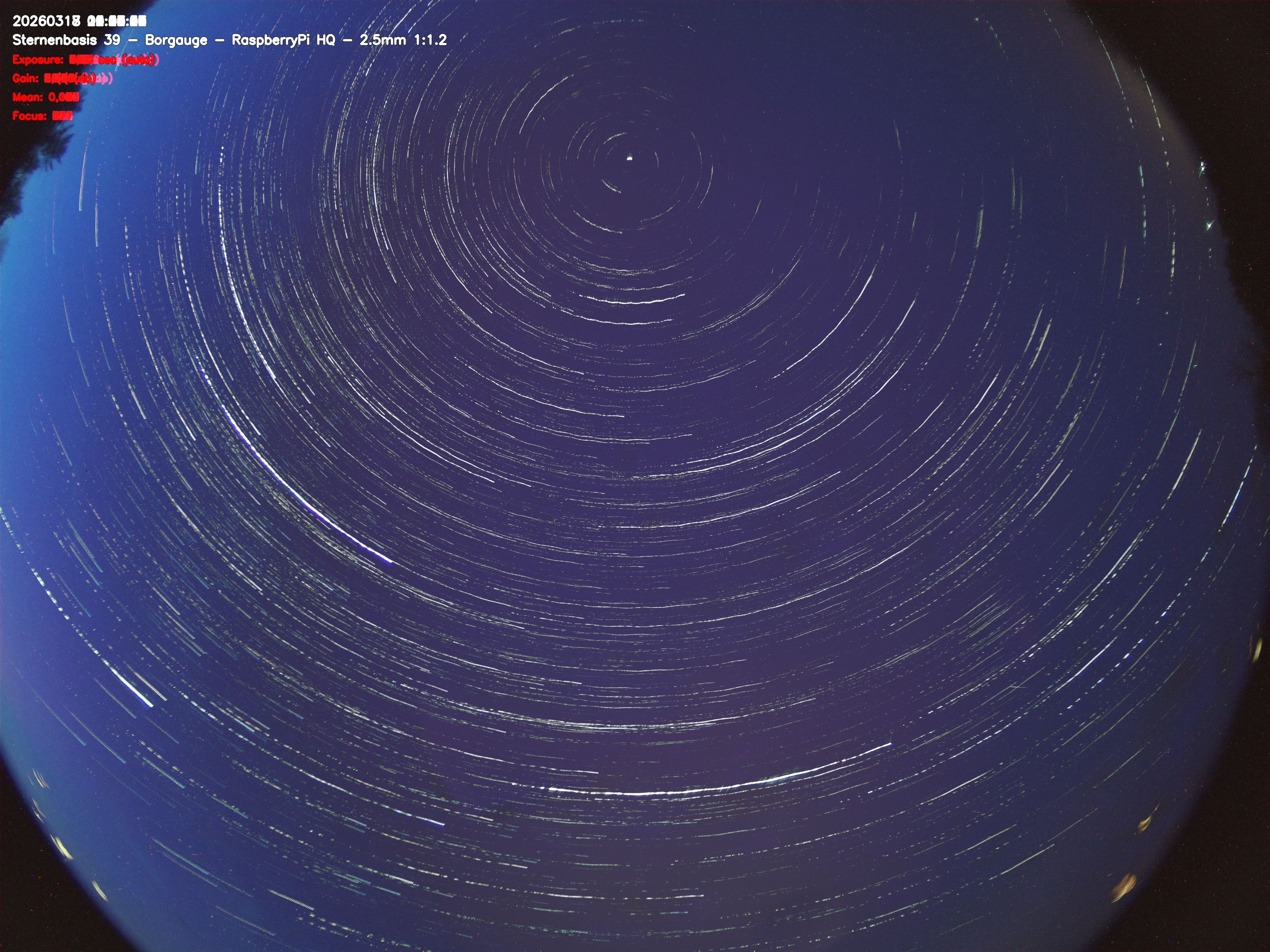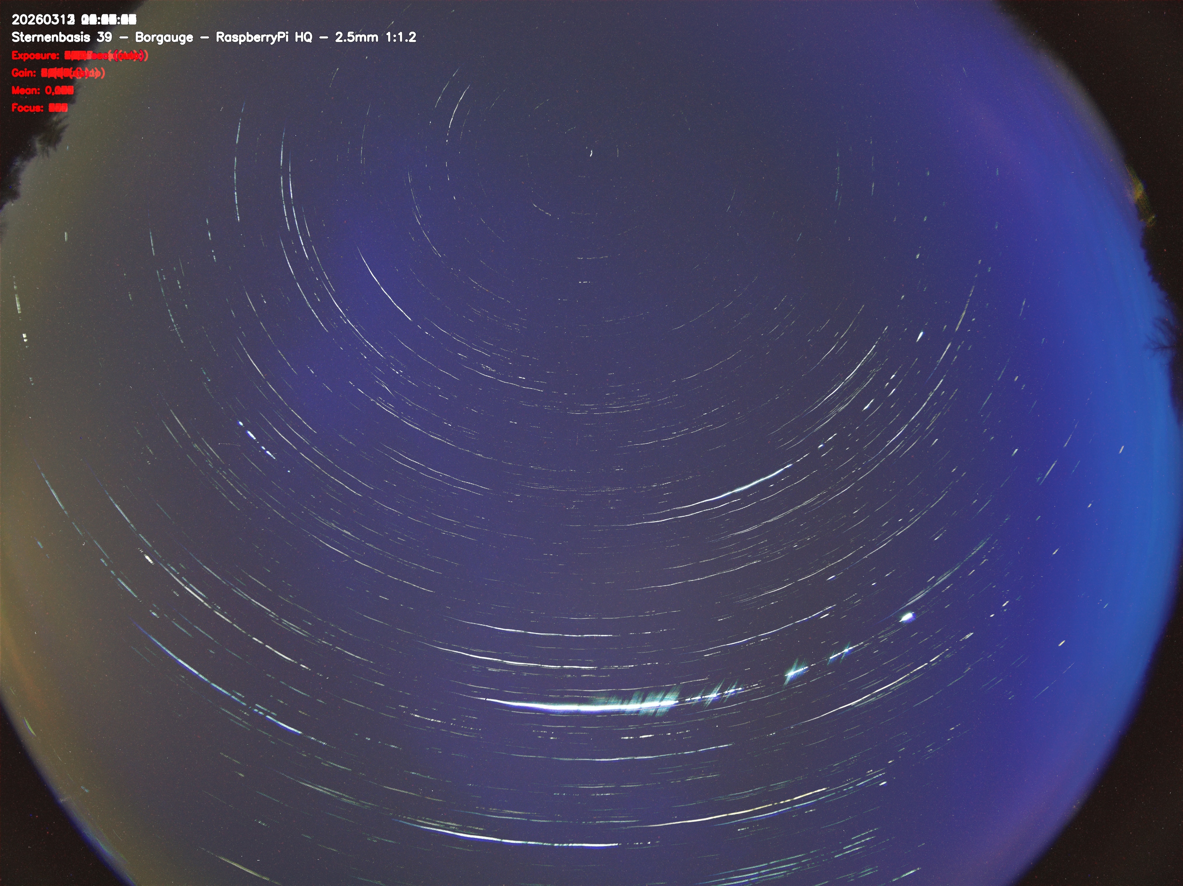 Version 2 der Allsky Kamera auf Sternenbasis 39. Die Aufnahme zeigt den Himmel auf Sternenbasis 39. Oben ist Norden. Westen ist rechts.- automatische Aktualisierung alls 90 Sekunden -