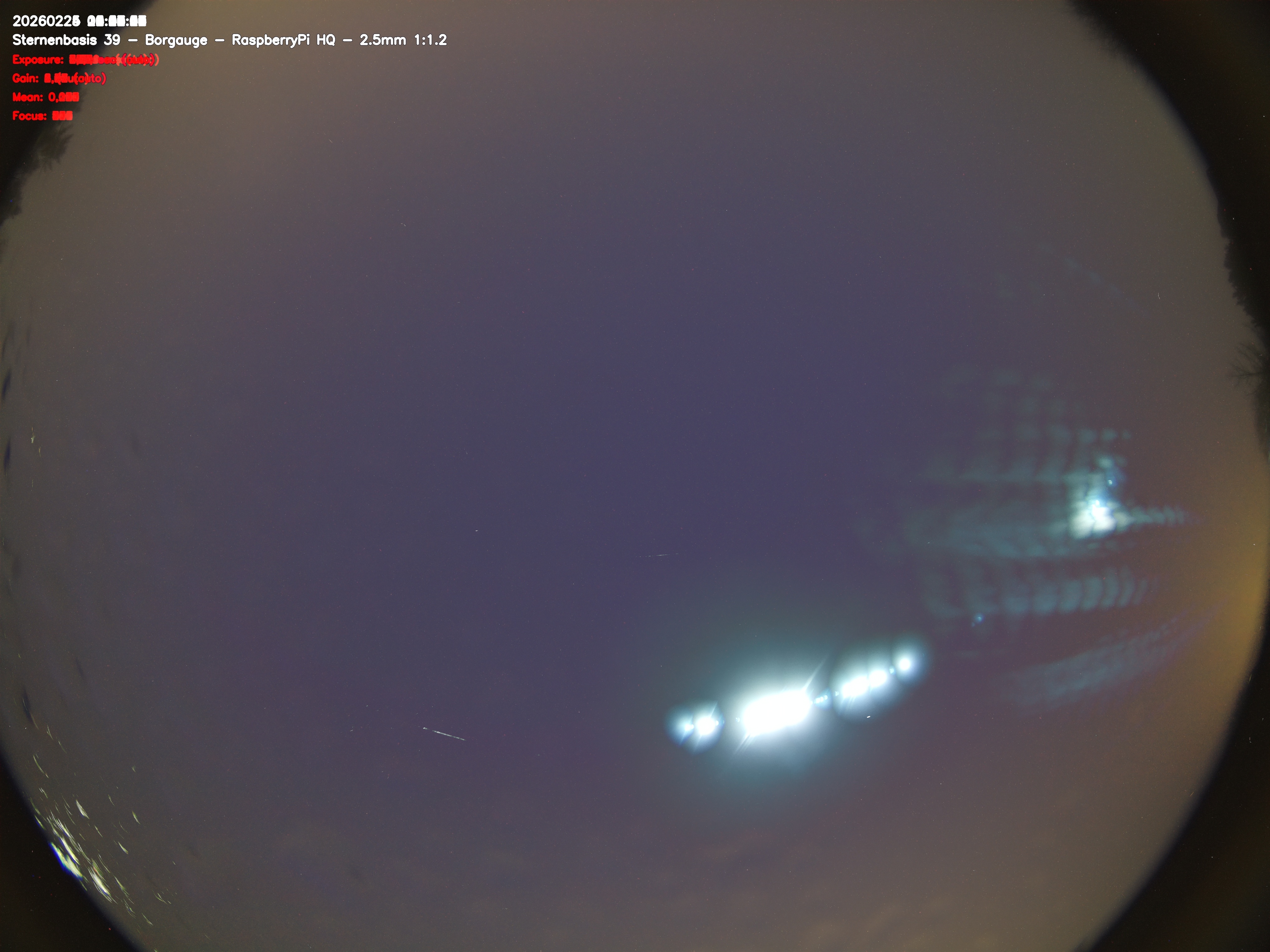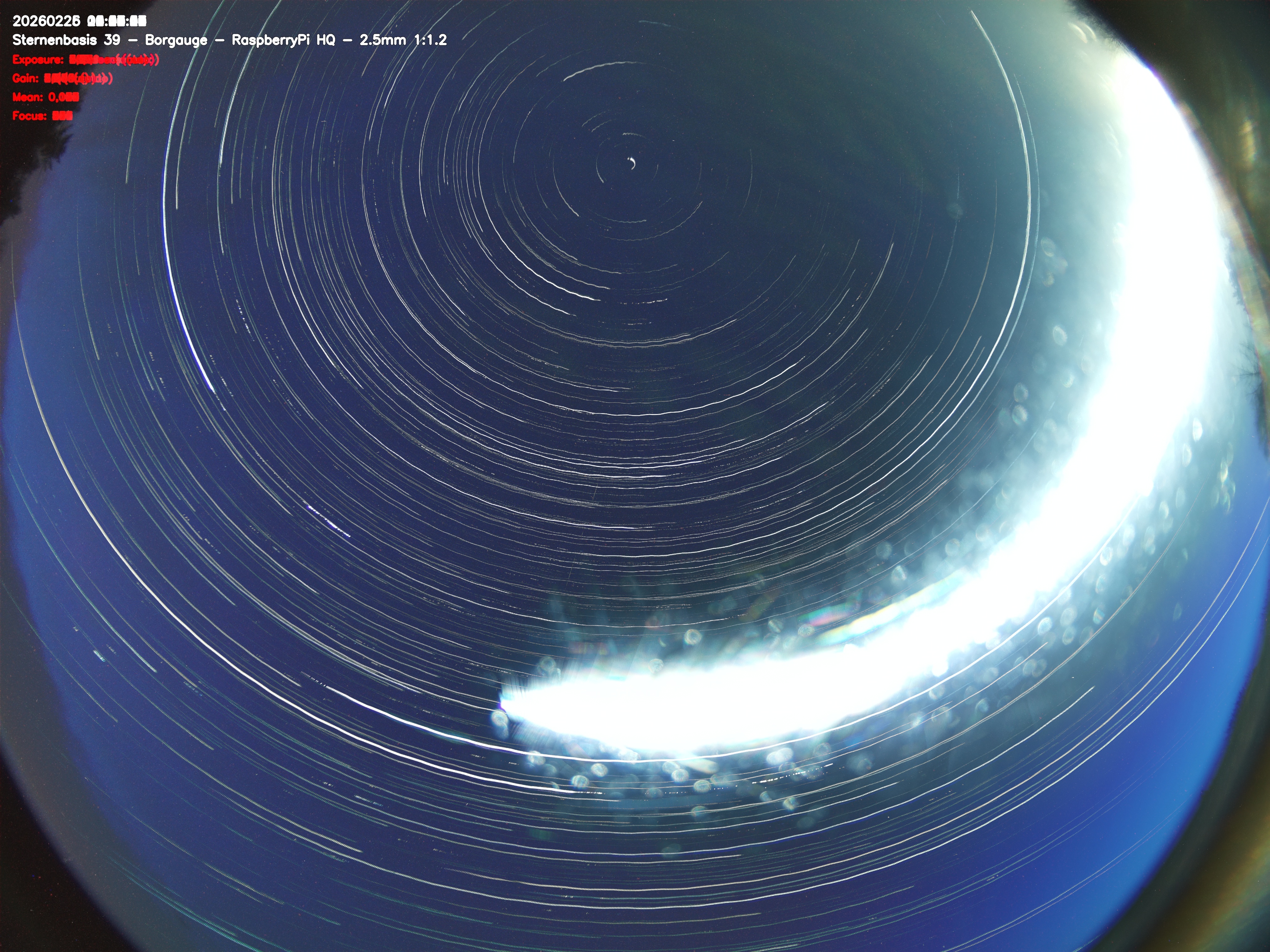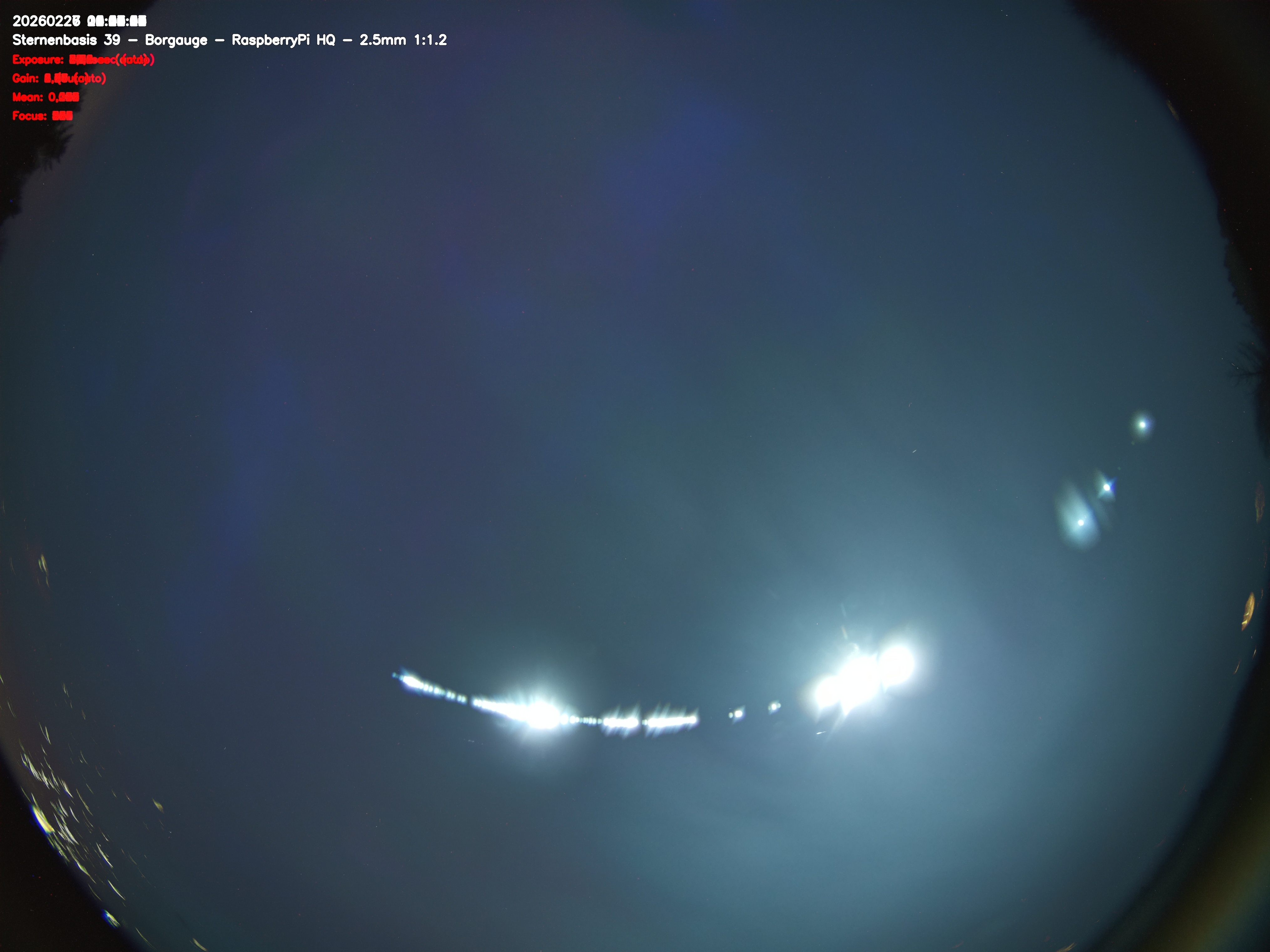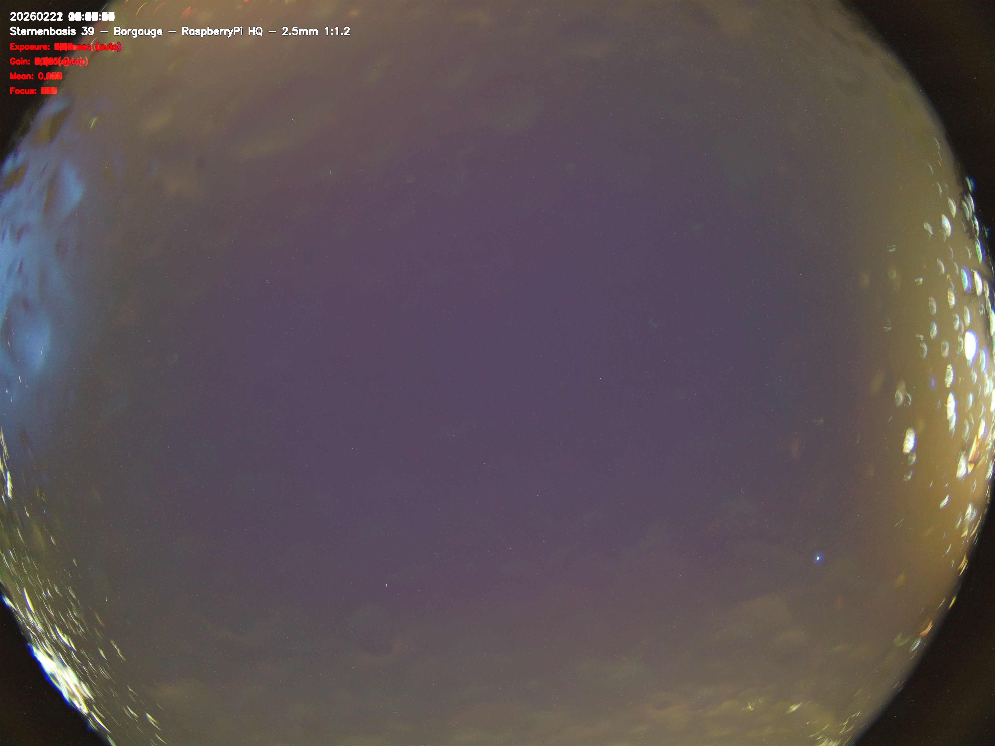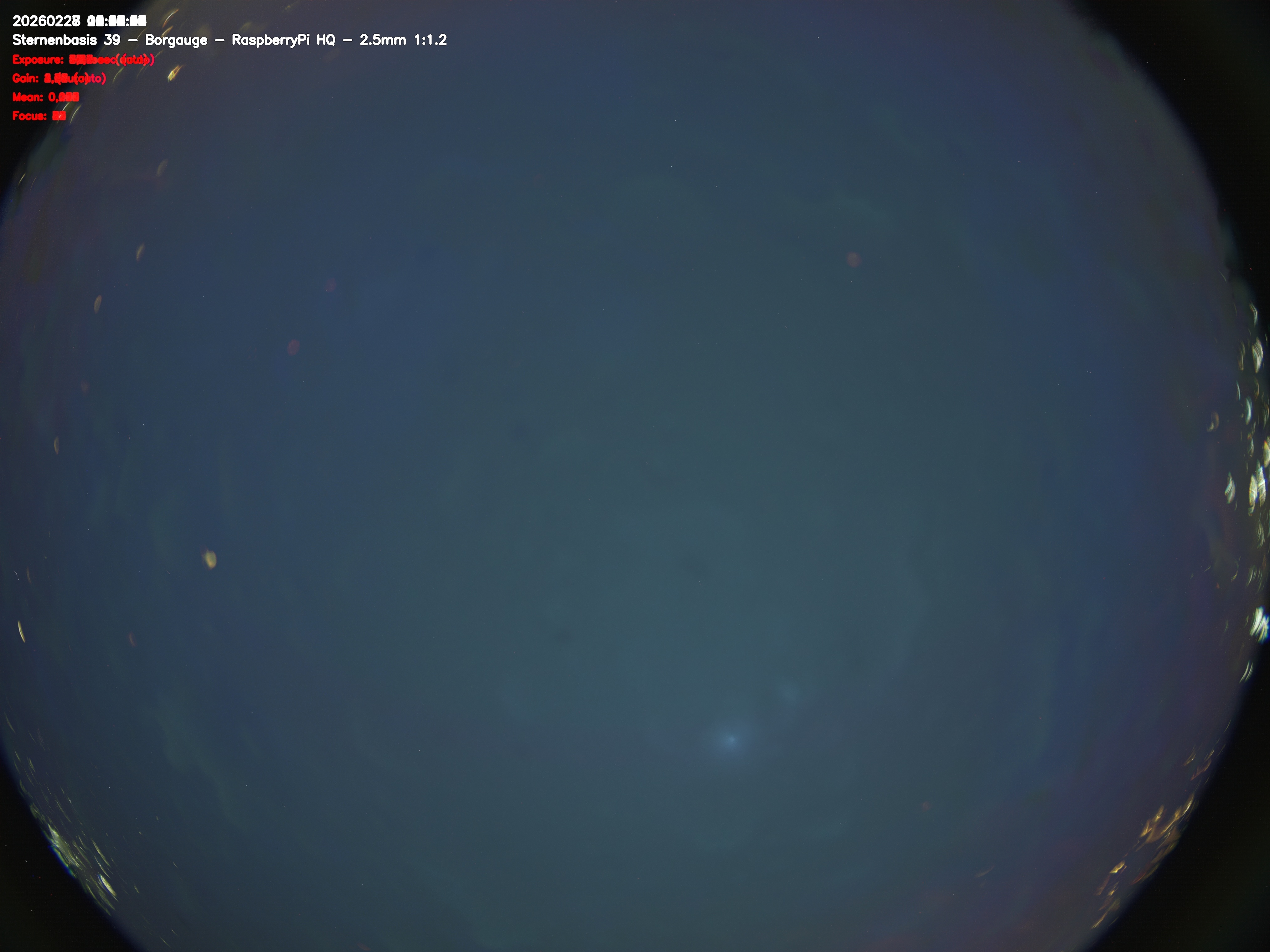 Version 2 der Allsky Kamera auf Sternenbasis 39. Die Aufnahme zeigt den Himmel auf Sternenbasis 39. Oben ist Norden. Westen ist rechts.- automatische Aktualisierung alls 90 Sekunden -