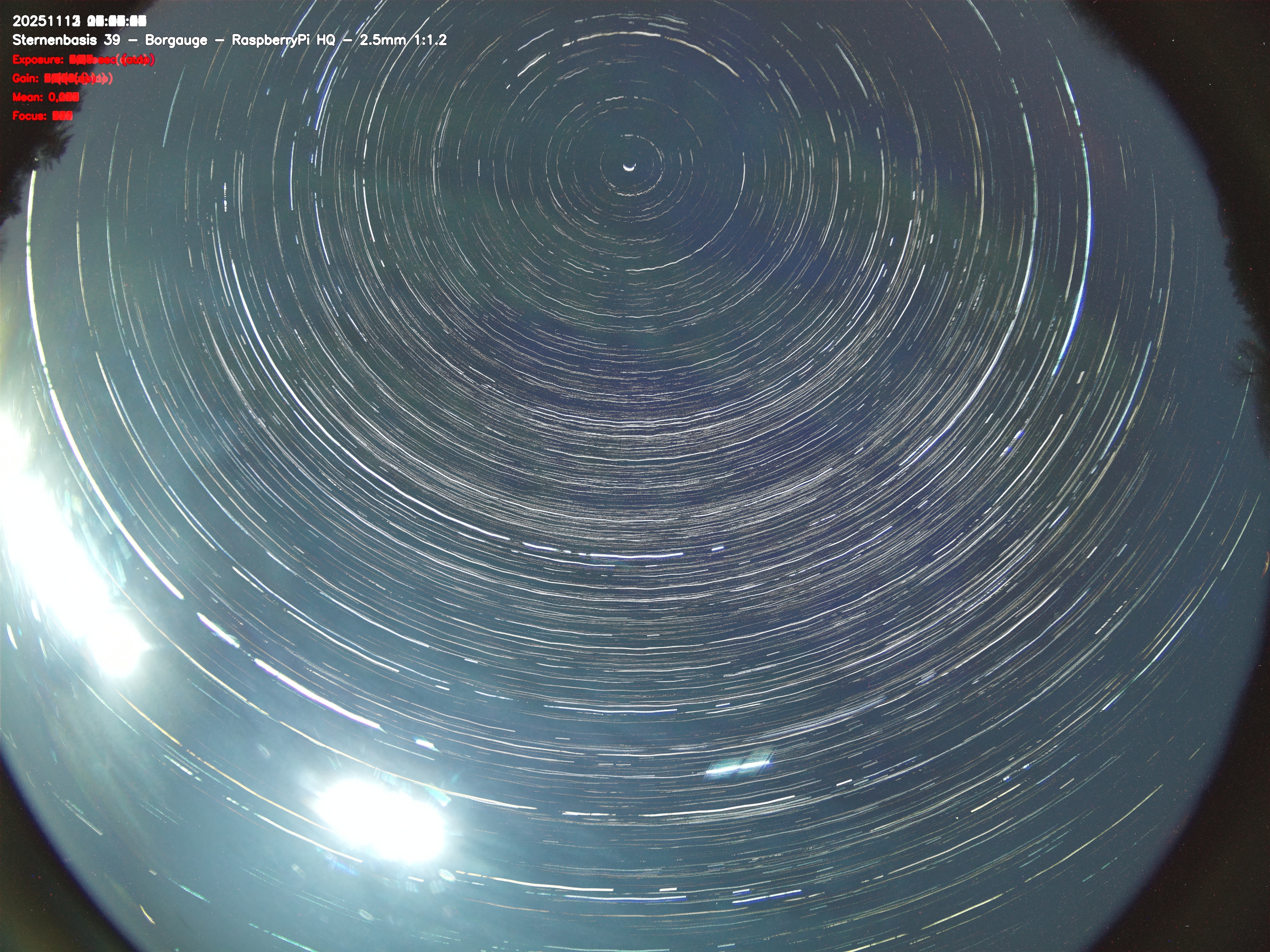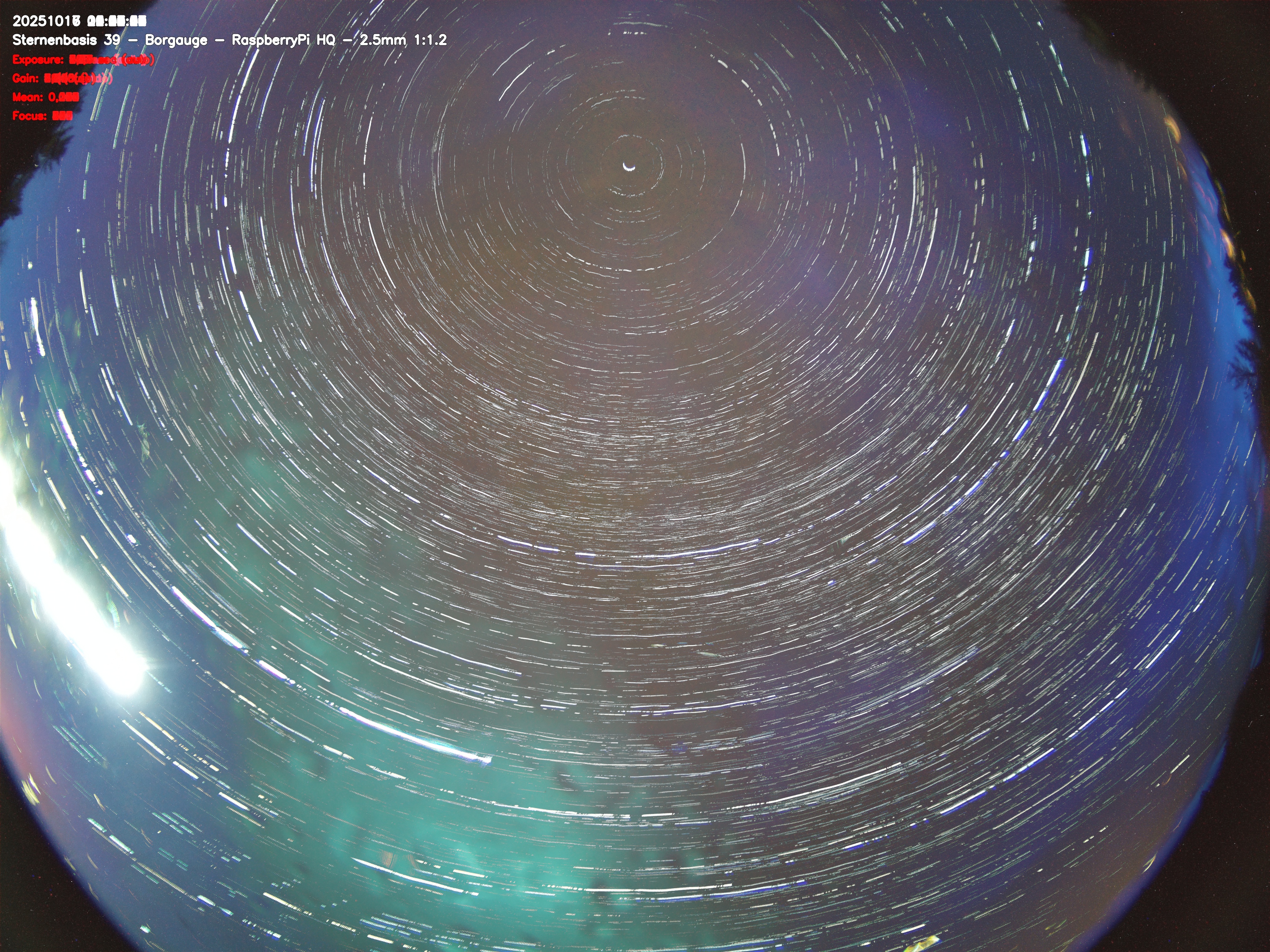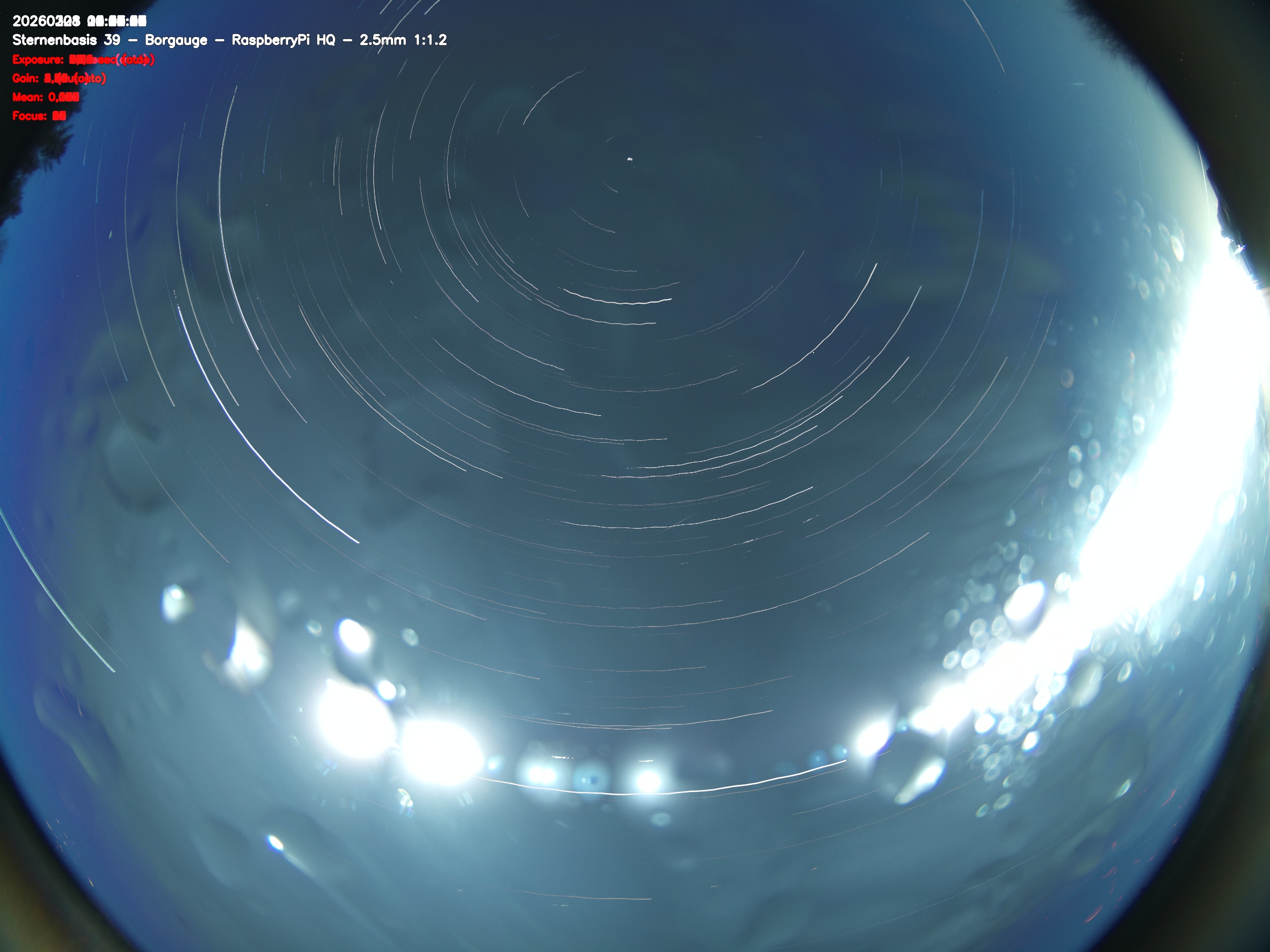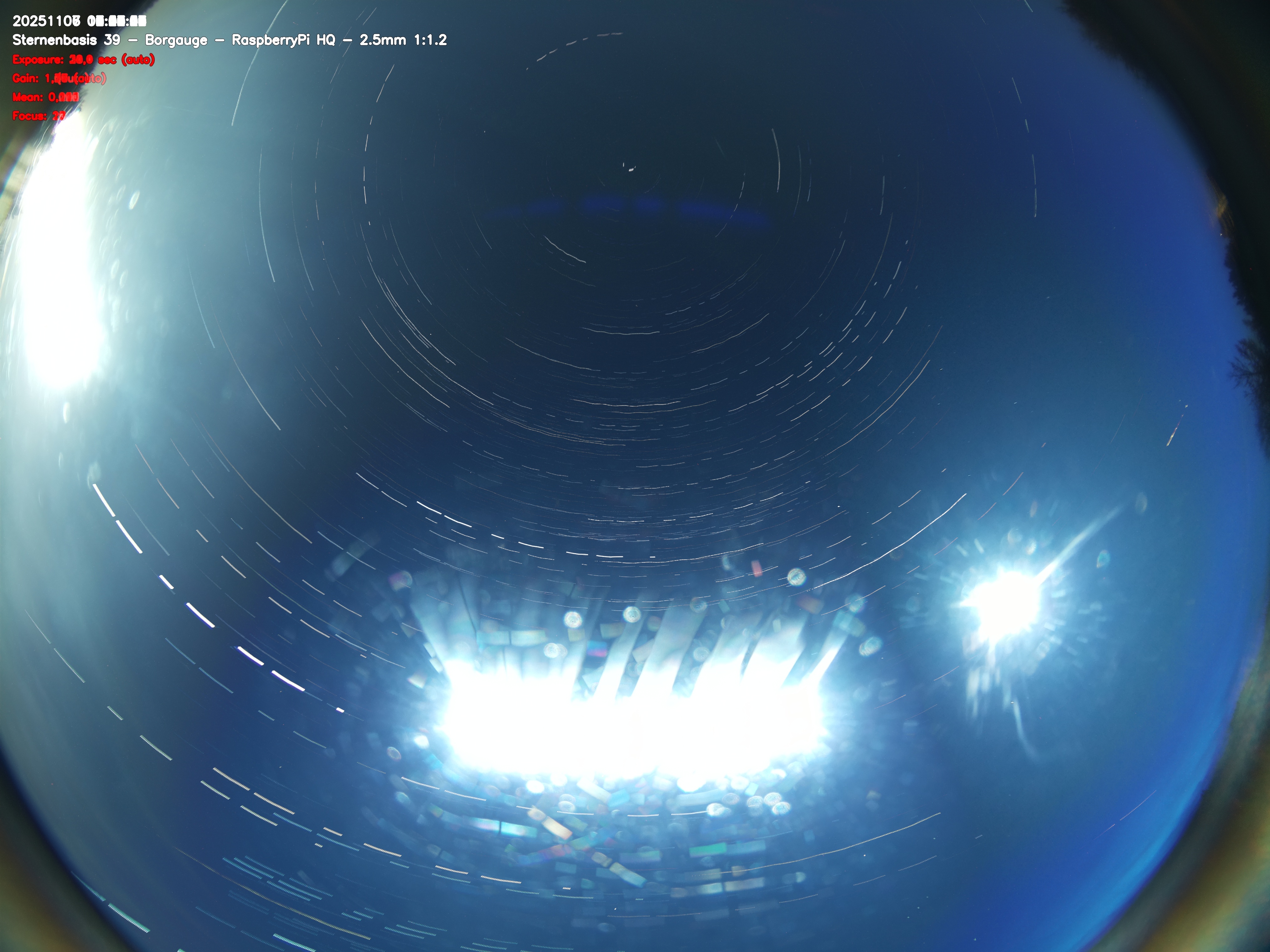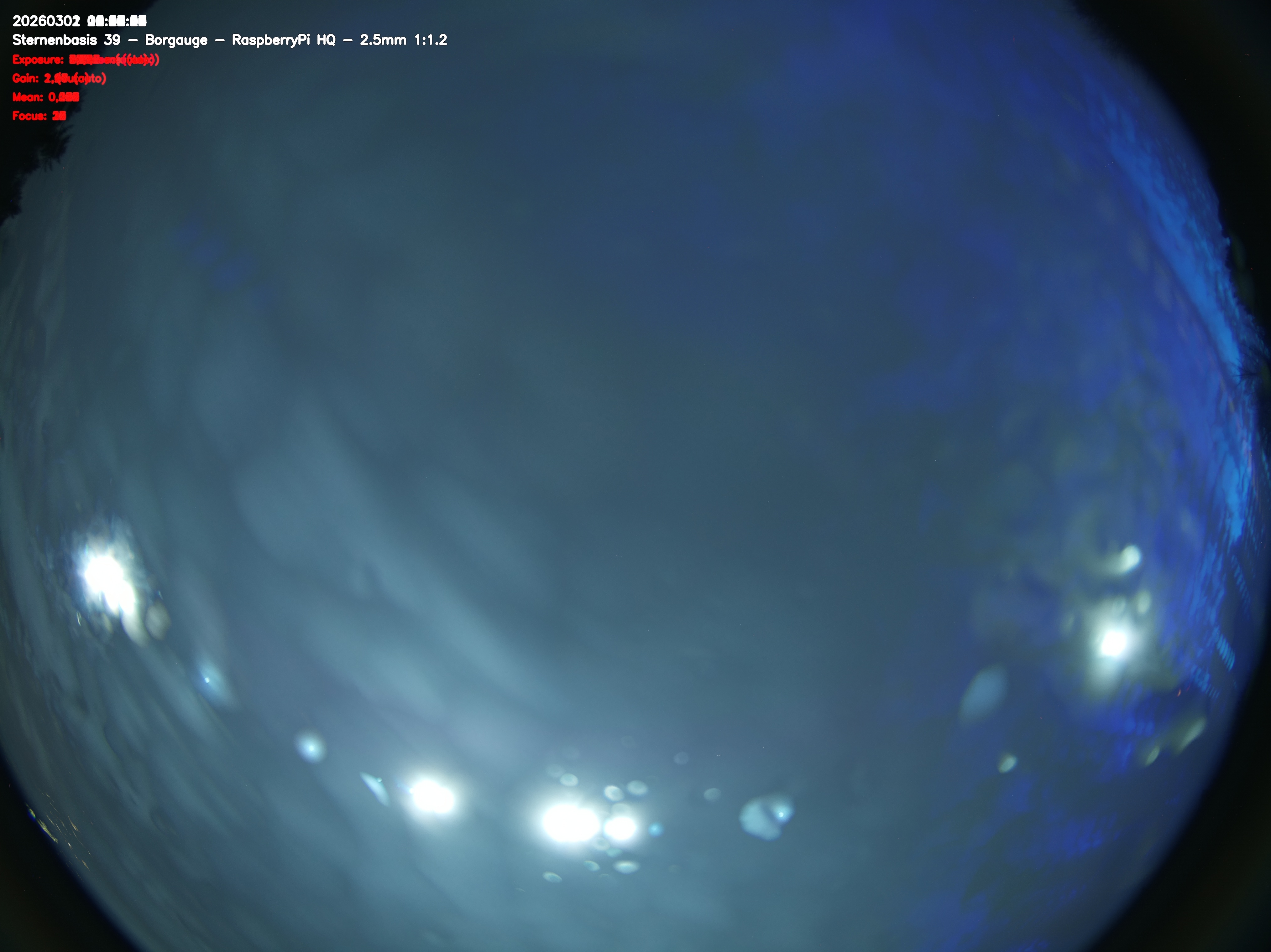 Version 2 der Allsky Kamera auf Sternenbasis 39. Die Aufnahme zeigt den Himmel auf Sternenbasis 39. Oben ist Norden. Westen ist rechts.- automatische Aktualisierung alls 90 Sekunden -