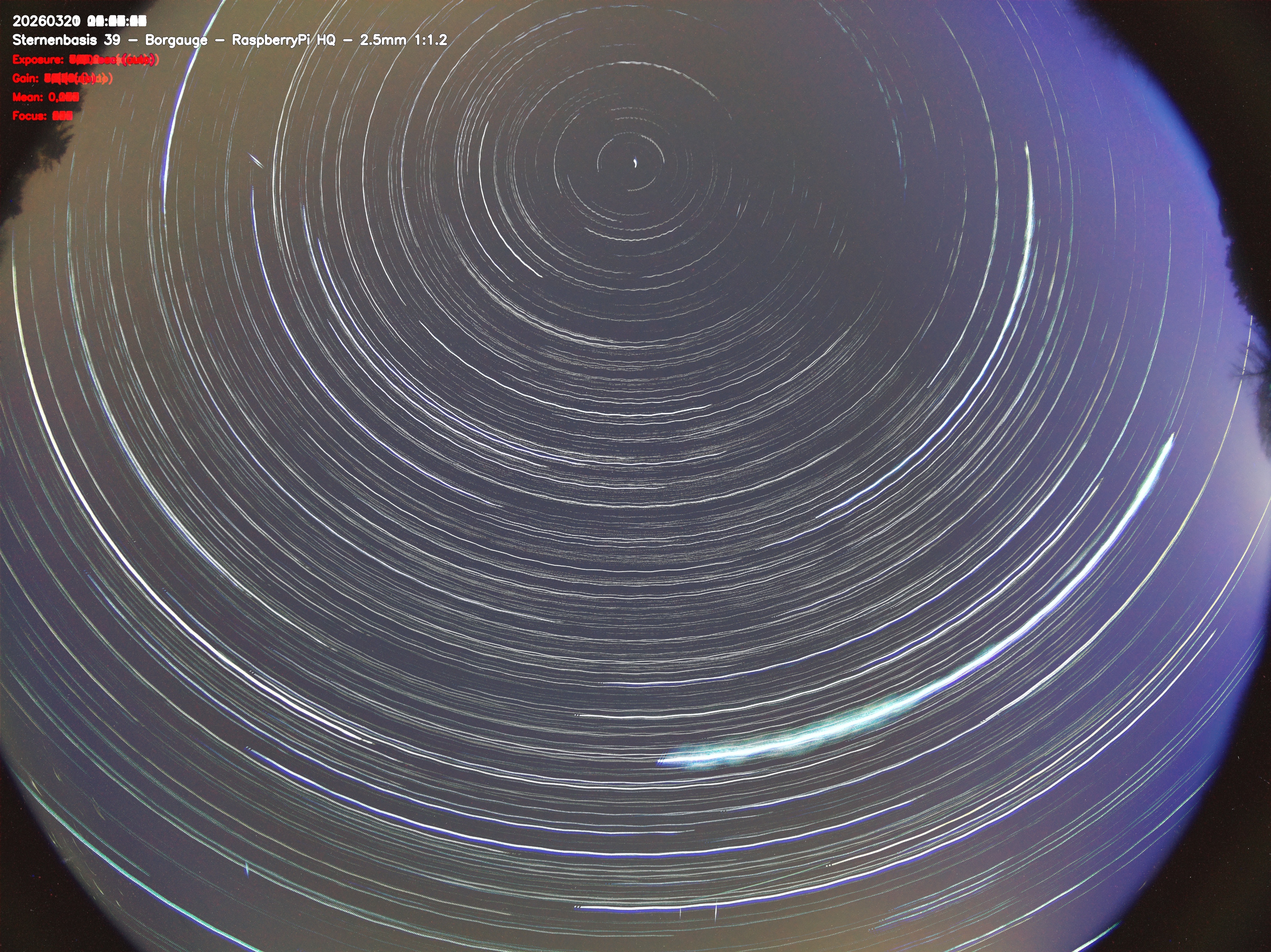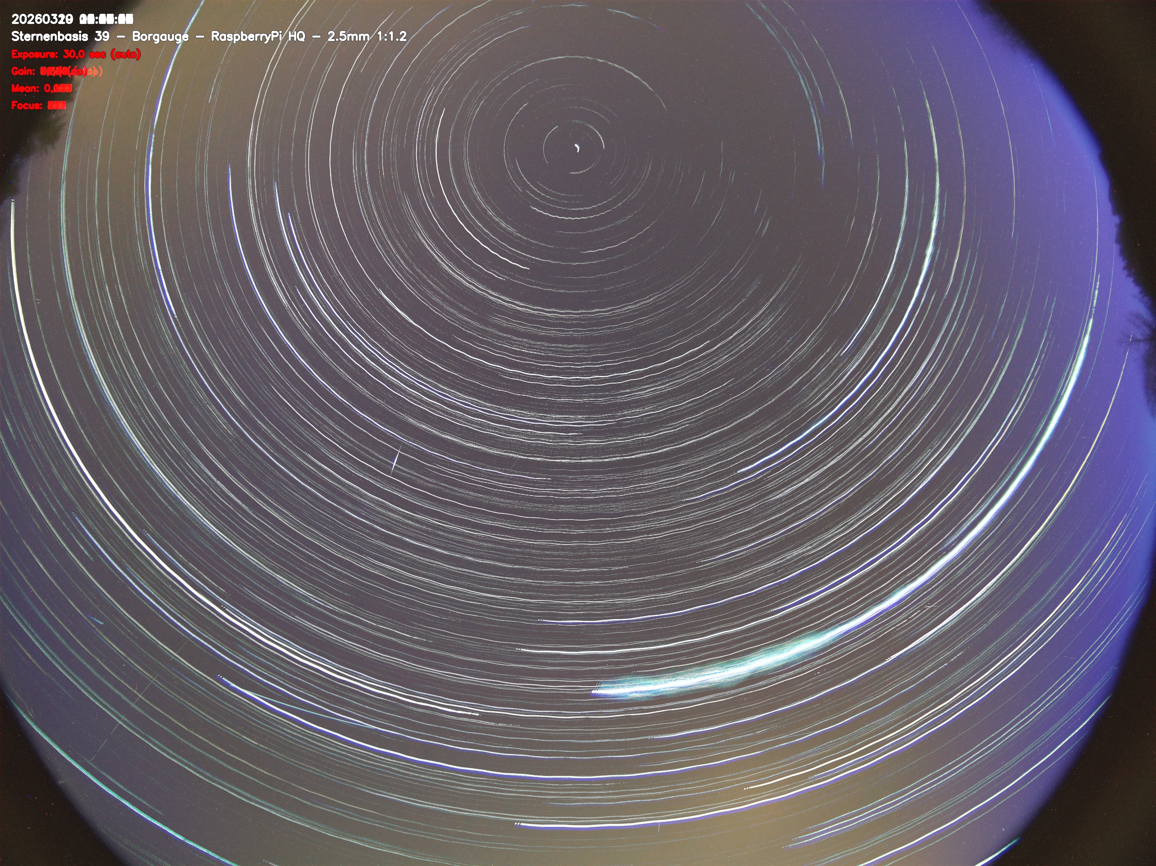 Version 2 der Allsky Kamera auf Sternenbasis 39. Die Aufnahme zeigt den Himmel auf Sternenbasis 39. Oben ist Norden. Westen ist rechts.- automatische Aktualisierung alls 90 Sekunden -
