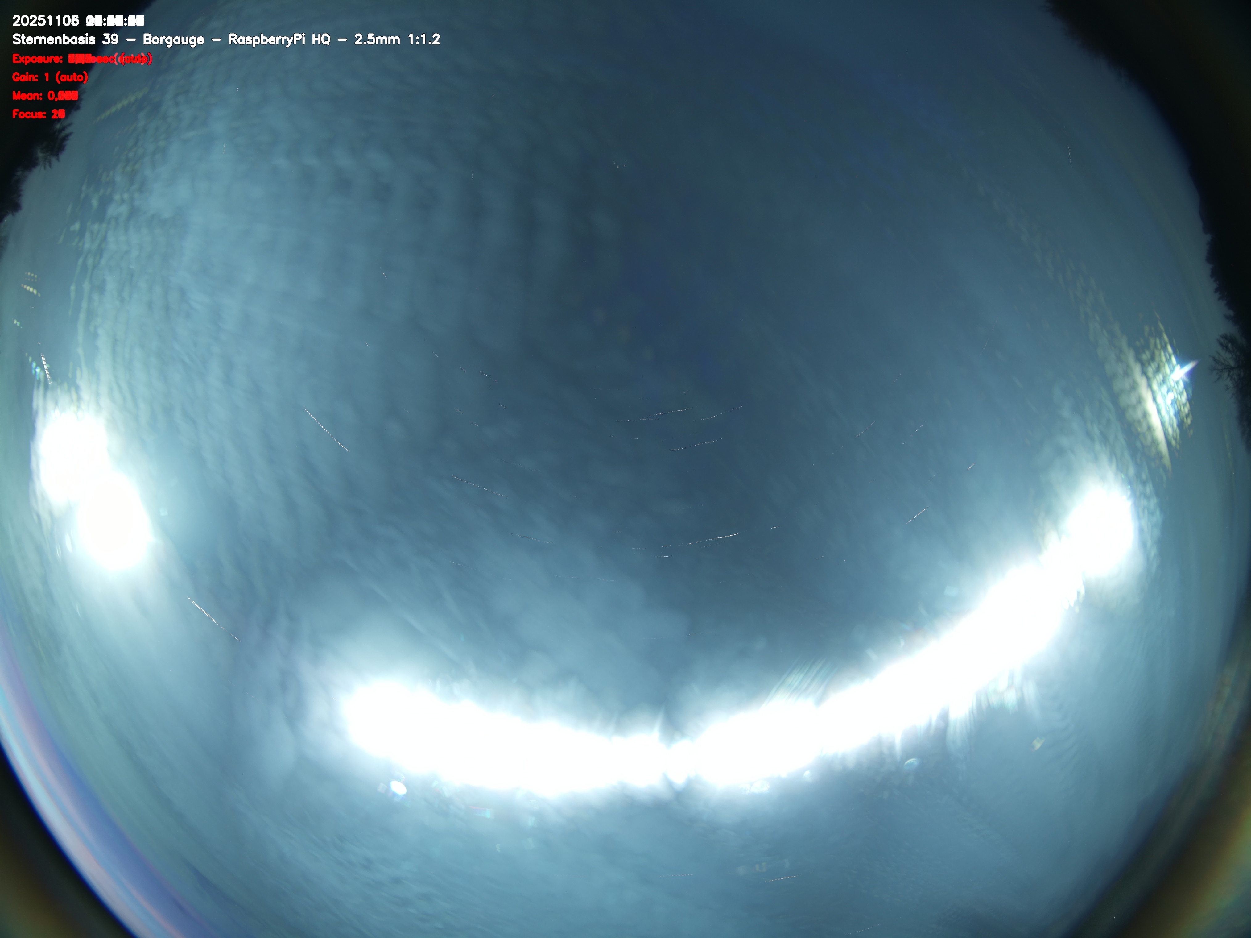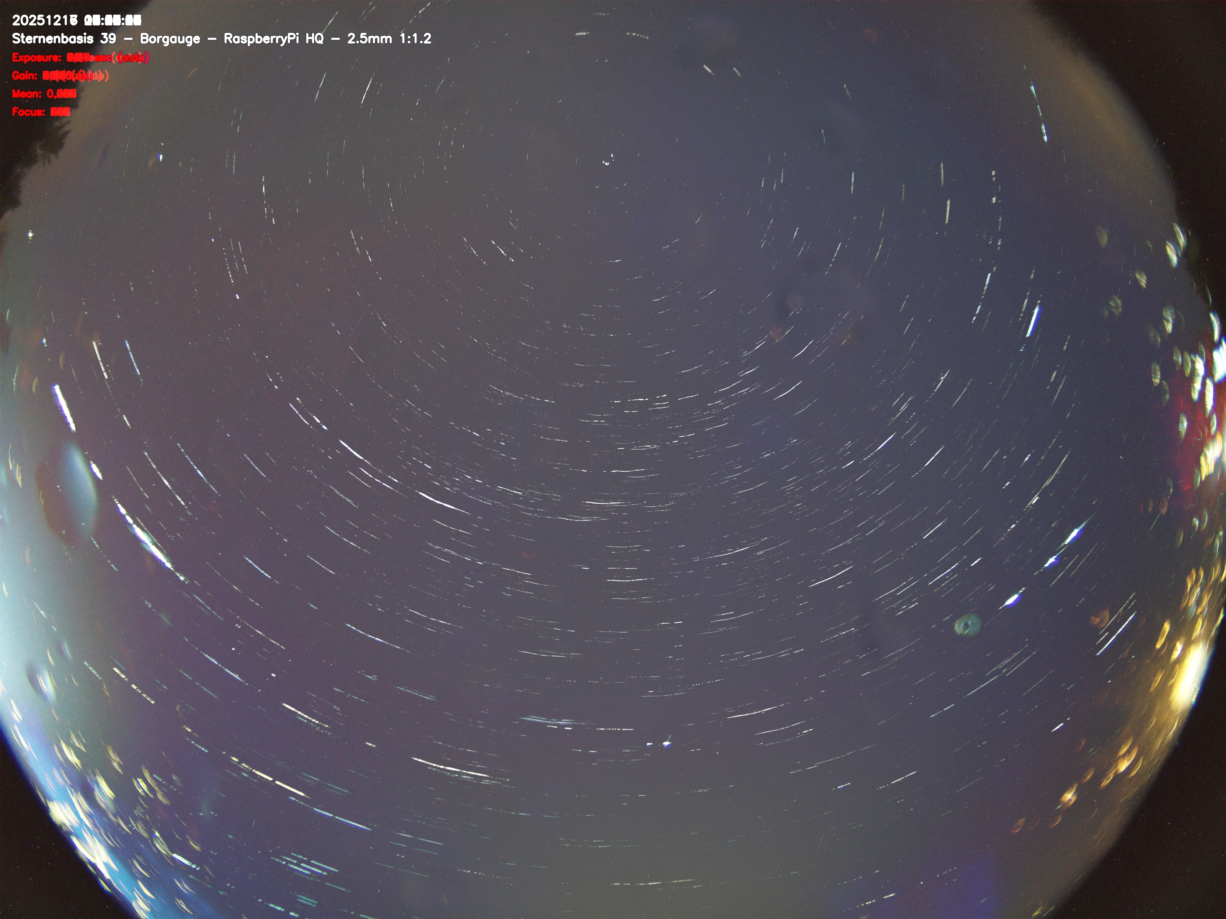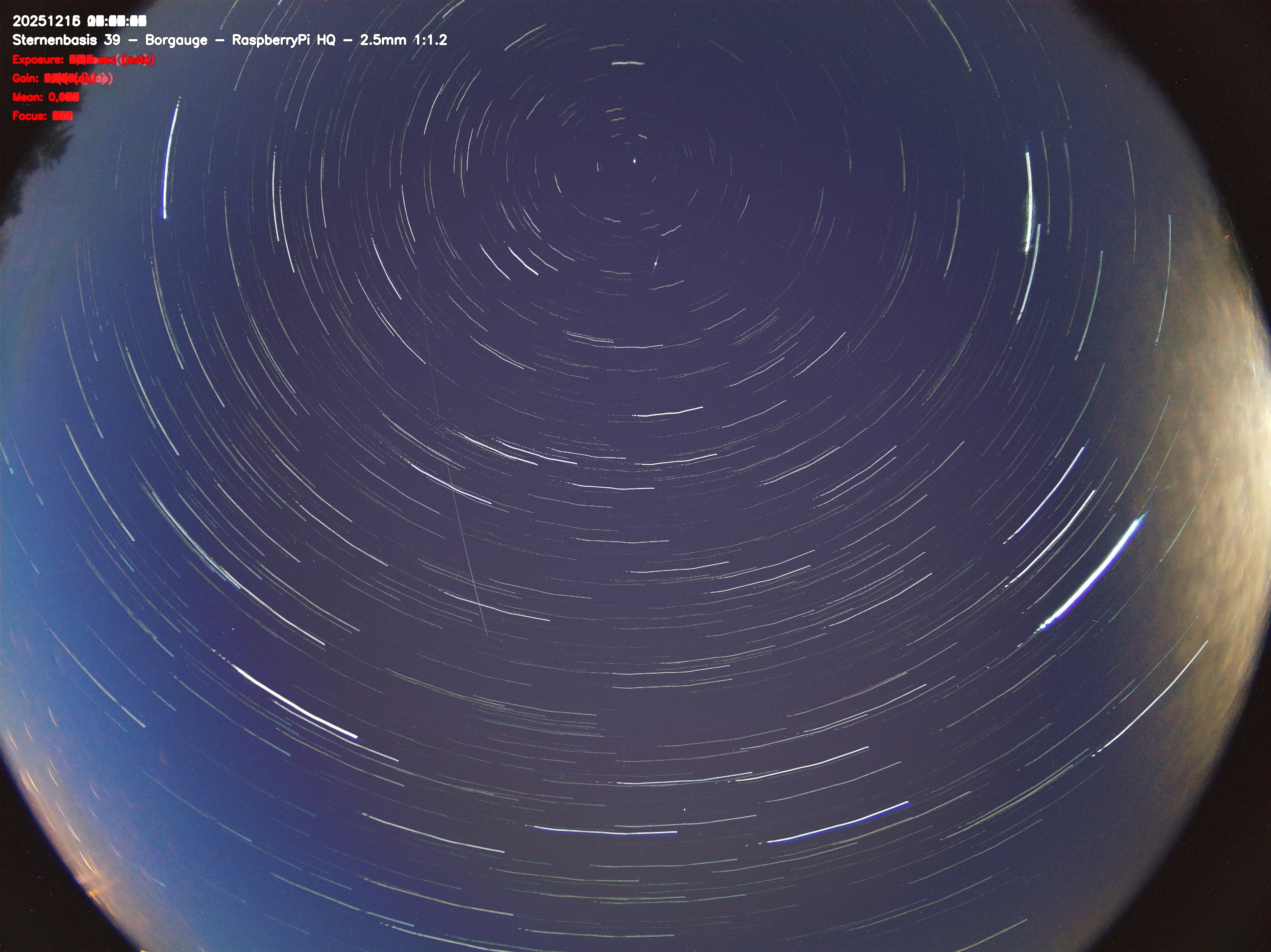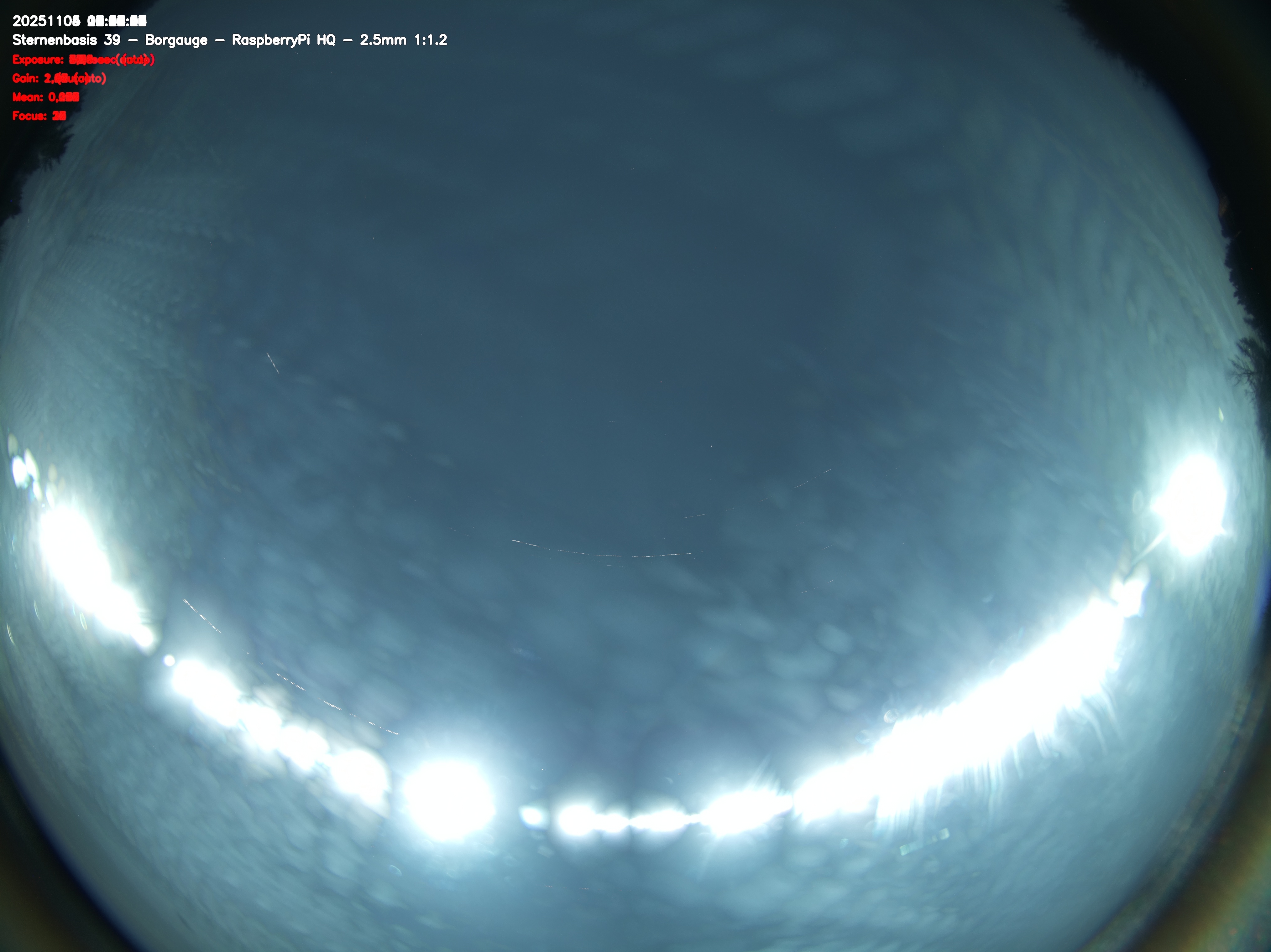 Version 2 der Allsky Kamera auf Sternenbasis 39. Die Aufnahme zeigt den Himmel auf Sternenbasis 39. Oben ist Norden. Westen ist rechts.- automatische Aktualisierung alls 90 Sekunden -