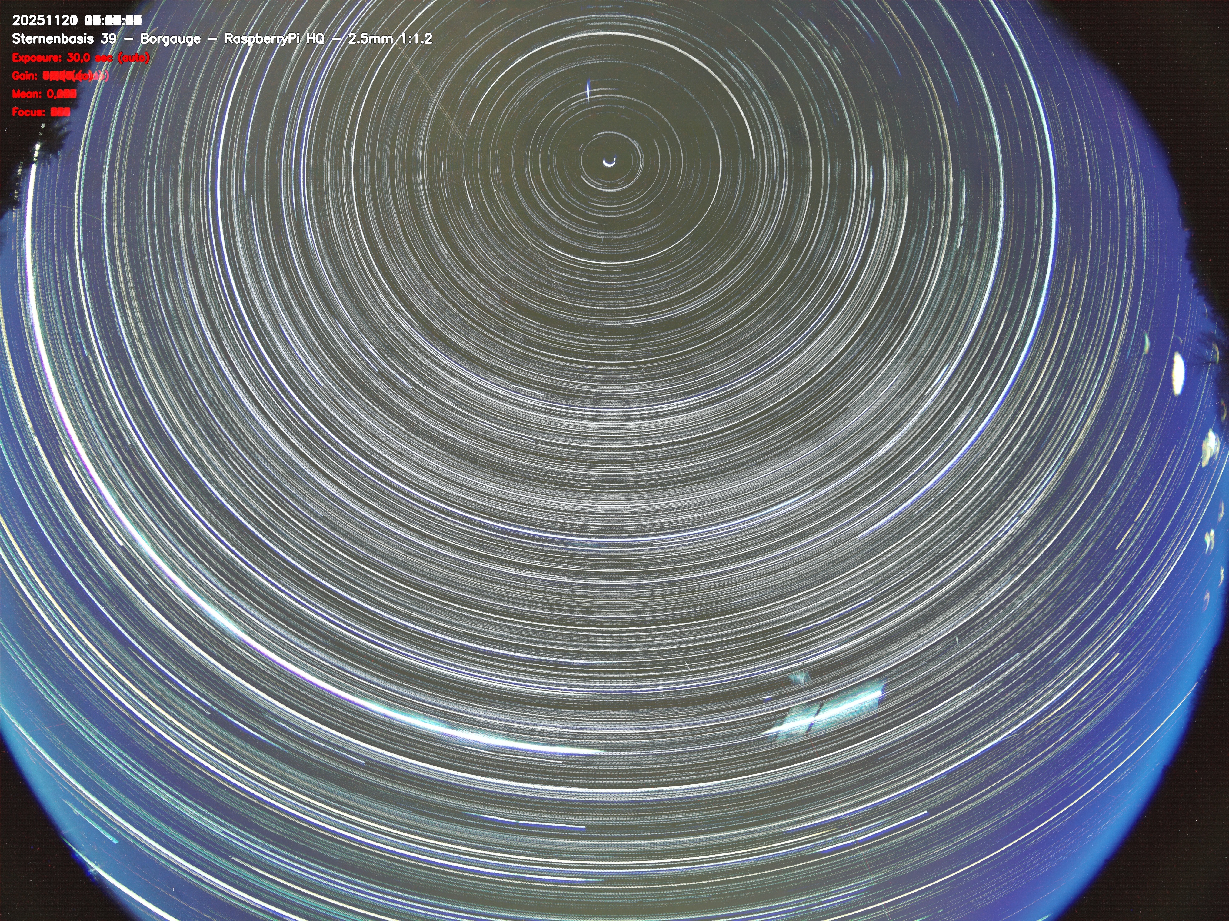 Version 2 der Allsky Kamera auf Sternenbasis 39. Die Aufnahme zeigt den Himmel auf Sternenbasis 39. Oben ist Norden. Westen ist rechts.- automatische Aktualisierung alls 90 Sekunden -