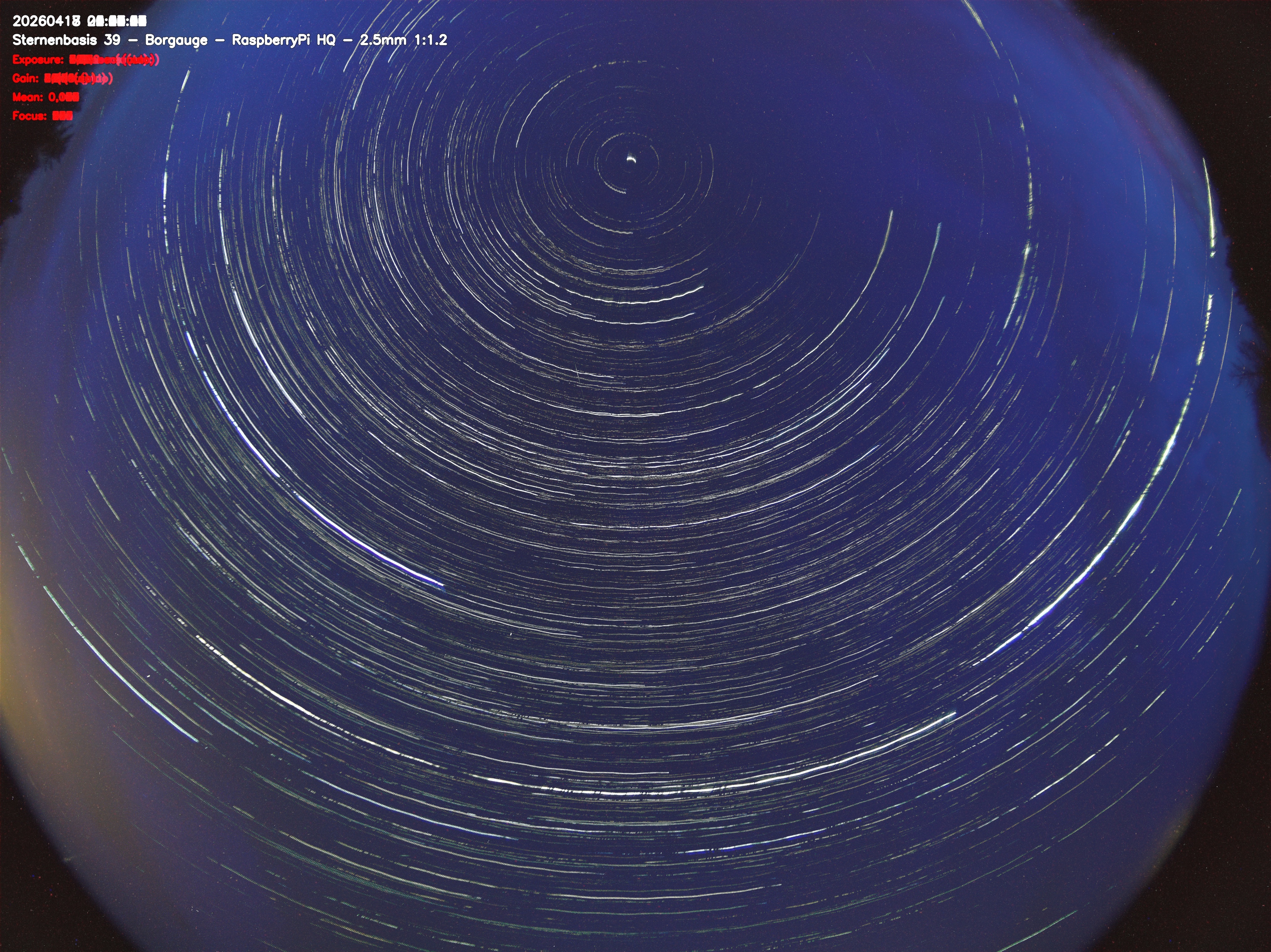 Version 2 der Allsky Kamera auf Sternenbasis 39. Die Aufnahme zeigt den Himmel auf Sternenbasis 39. Oben ist Norden. Westen ist rechts.- automatische Aktualisierung alls 90 Sekunden -